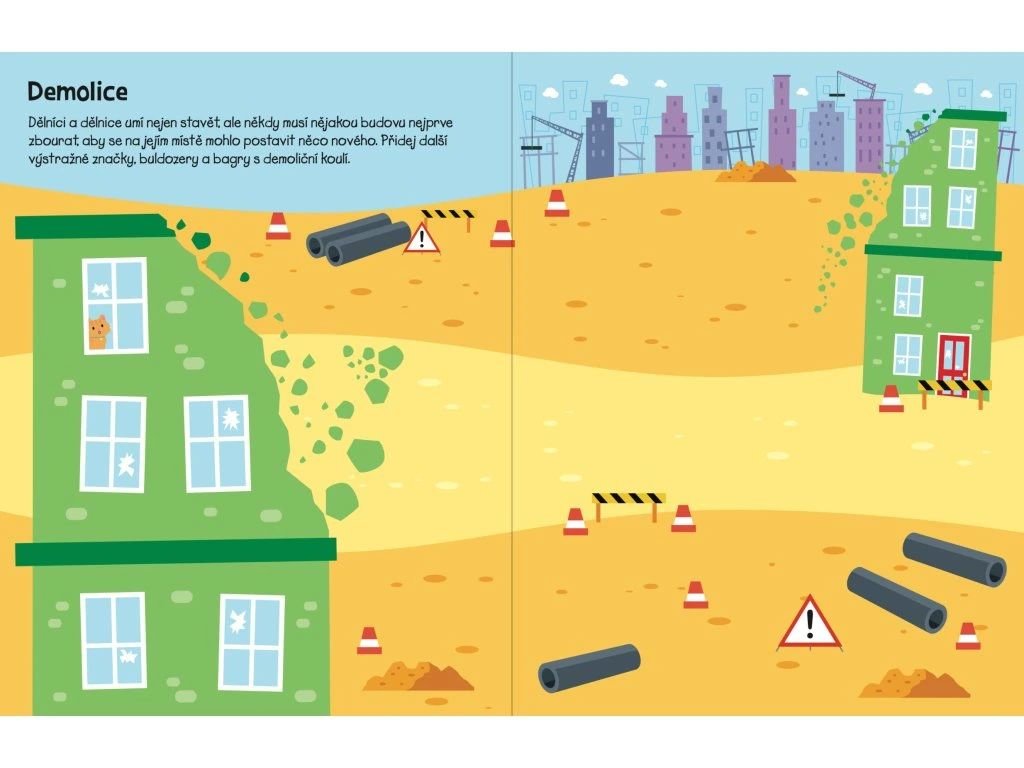 Samolepkový sešit s nejrůznějšími samolepkami s tematikou stavenišť rozvíjí představivost, trpělivost a jemné motorické dovednosti.