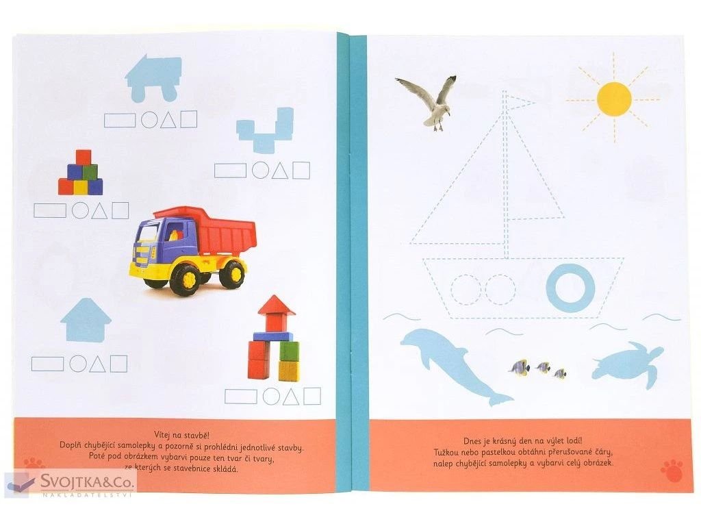 - Sešit obsahuje cvičení na vybarvování, dolepování veselých samolepek a obtahování čar.
