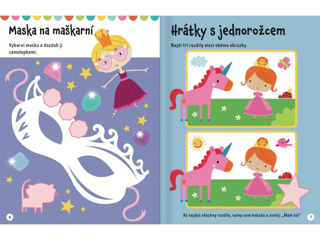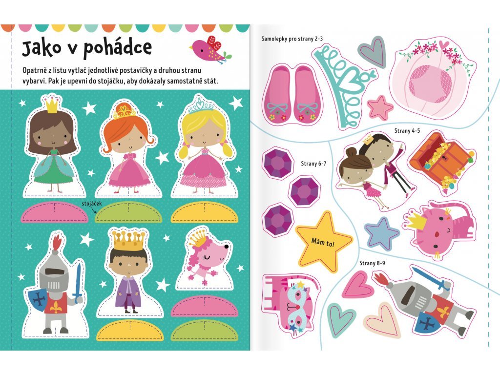 - Dolepuj samolepky, vybarvuj obrázky a doplňuj! Tento sešit s roztomilými samolepkami a vytlačovacím palácem s pohádkovými postavami ti zajistí plno zábavy!