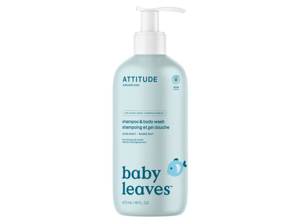 Přírodní, certifikovaný a dermatologicky testovaný šampon a tělové mýdlo 2v1 ATTITUDE Baby leaves s vůní Good night pro děti. Kombinace šamponu a tělového mýdla usnadní čas koupání a je ideální zároveň pro jemné čištění pokožky hlavy a citlivé pokožky vašeho dítěte již od narození.