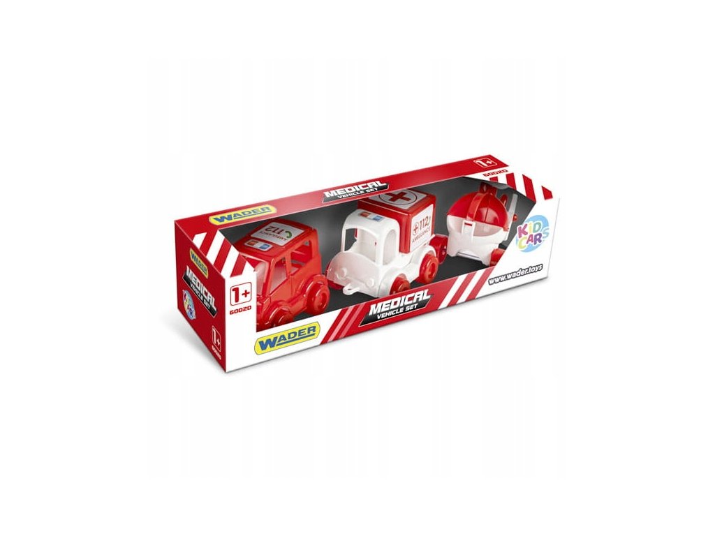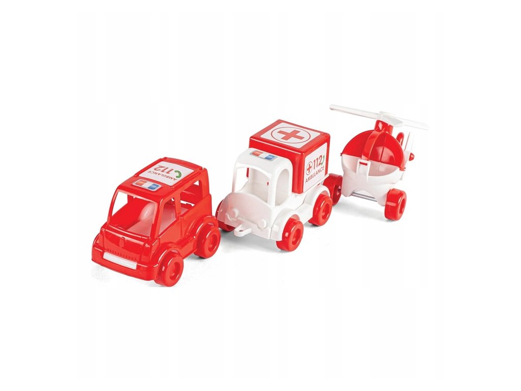 V lékařském setu najdeme barevnou sadu 3 autíček: sanitku, zdravotnickou přepravu a vrtulník.
