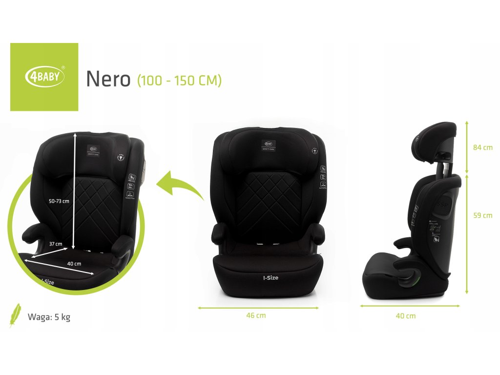 Nero i-Size je moderní autosedačka určená pro rodiče, kteří hledají řešení kombinující komplexní bezpečnost a funkčnost. Model Nero i-Size je určen pro děti o výšce 100 až 150 cm a splňuje nejnovější bezpečnostní normy v souladu s normou R129 i-Size. Sedačka se montuje po směru jízdy pomocí tříbodových bezpečnostních pásů.