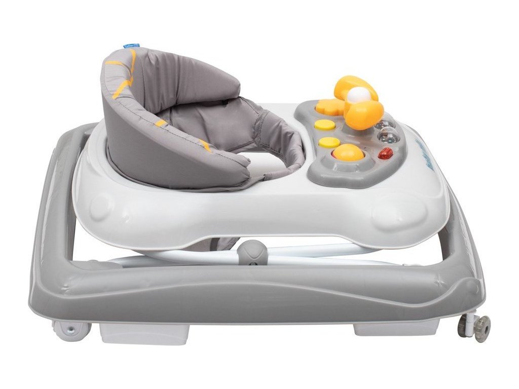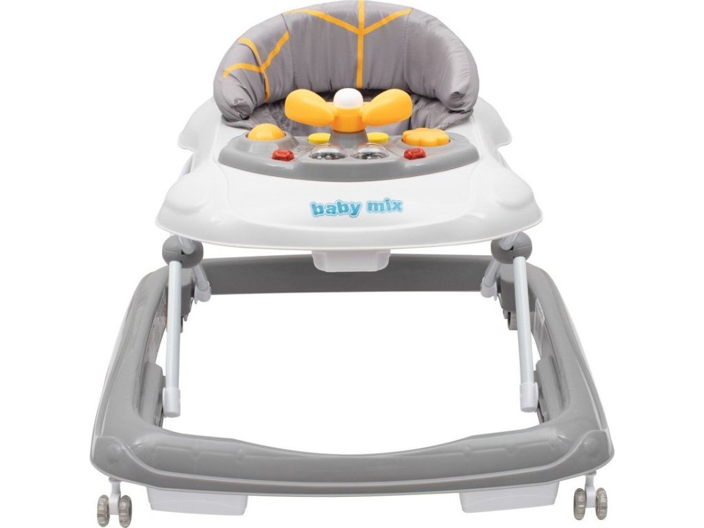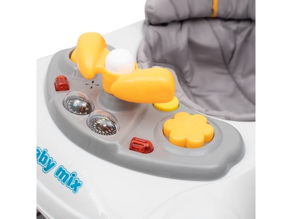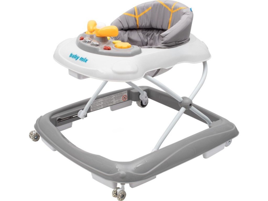 Multimediální chodítko Baby Mix se silikonovými kolečky. Chodítko je vybaveno pohodlným ergonomicky tvarovaným sedadlem, které zajišťuje správné držení páteře. Multimediální panel obsahuje různé světelné efekty, troubící volant, kterým lze otáčet, tlačítka pro přehrávání melodií a dvě světla. Krásné chodítko s hračkami okouzlí malé objevitele a umožní jim hrát si ještě déle. Chodítko je vybaveno speciálním systémem proti převrácení, který zajistí Vašemu dítěti pohodlí a bezpečnost.
