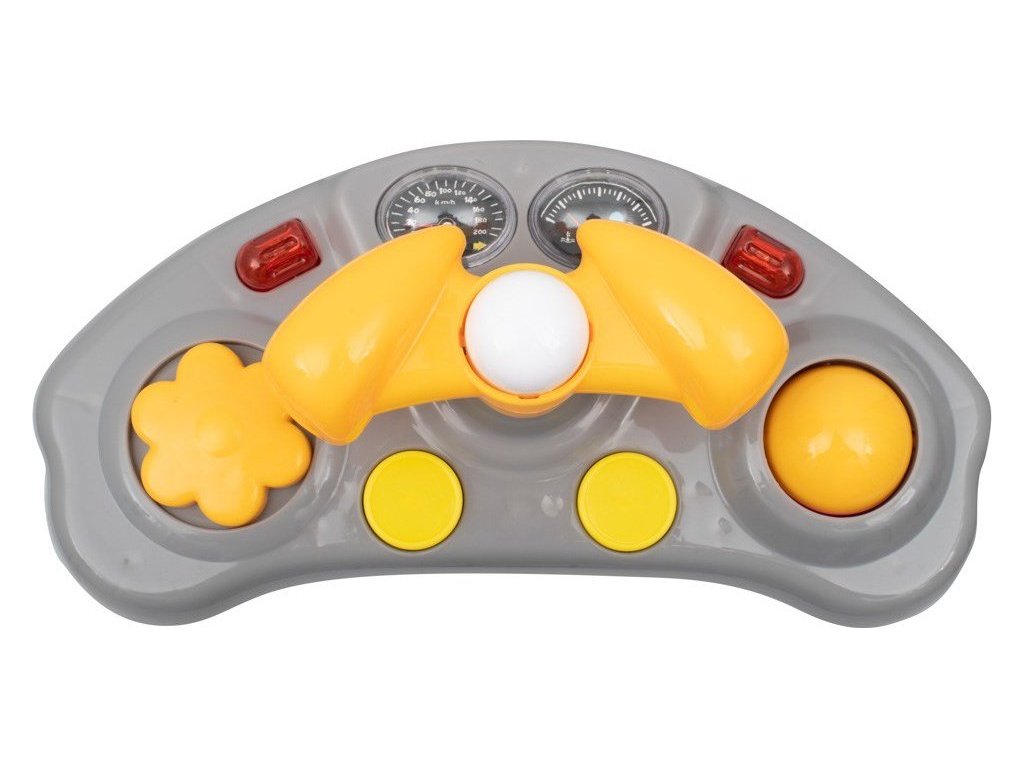 - Multimediální panel se zvukovými a světelnými efekty, 12 hracích melodií, klakson s otočným volantem (napájeno 2x1,5V AA bateriemi - nejsou součástí balení)