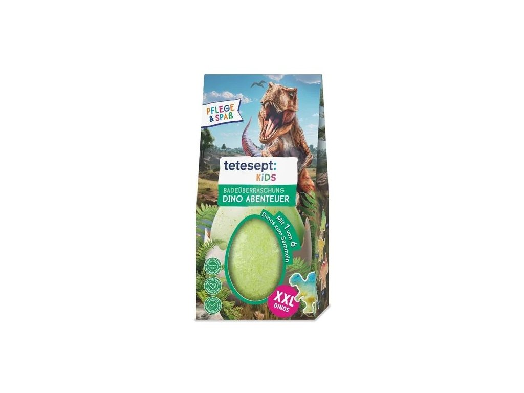 Zpříjemněte dětem večerní koupání a sáhněte po koupelové kouli Dobrodružství s dinosaury od značky Tetesept. Složení je šetrné k citlivé dětské pokožce, obsahuje olej z hroznových semínek a avokádový olej. Ve vaně vytvoří šumivý efekt, navíc vodu obarví na zeleno a krásně provoní koupelnu limetkovou vůní. V balení se ukrývá milé překvapení – jedna ze šesti sběratelských figurek dinosaurů. Produkt je veganský a jeho snášenlivost pokožkou byla dermatologicky testována.