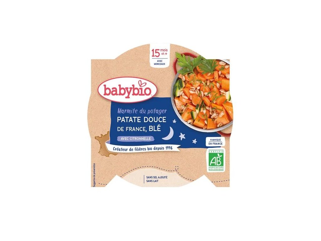 Babybio Sladký brambor, mrkev, cuketa a pšenice je vhodné večerní menu pro malé děti od ukončeného 15. měsíce. Kombinace bio zeleniny s přílohou zasytí, aniž by zatížila před spaním bříško.