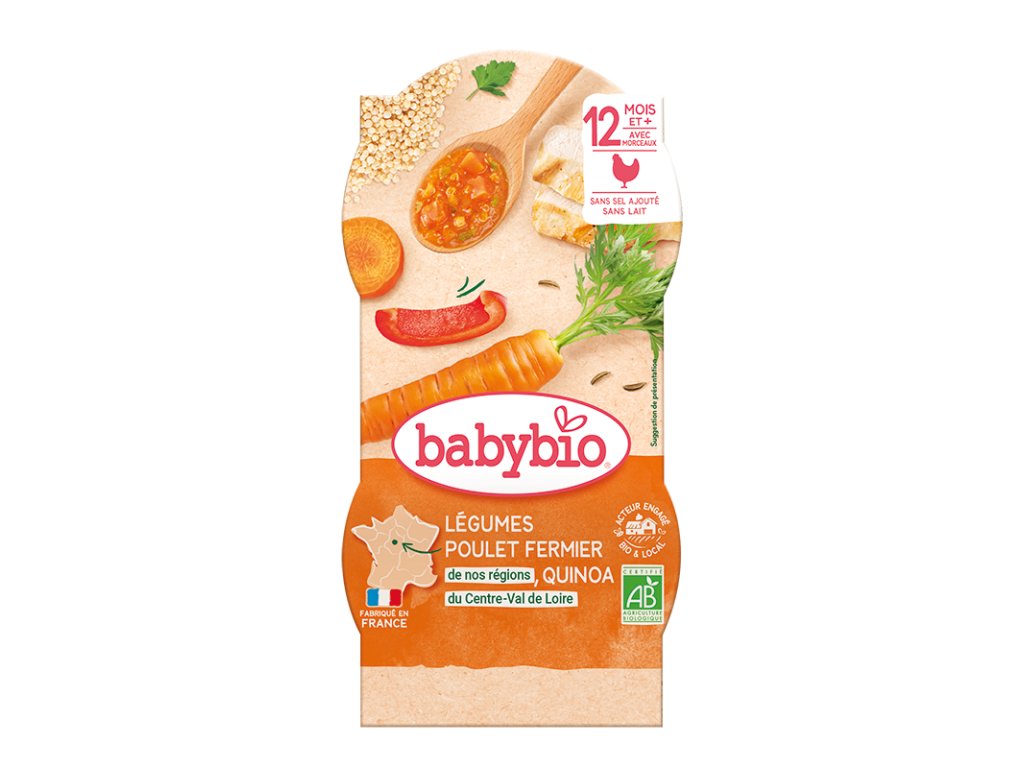 V době, kdy své malé děťátko přechází na "dospěláckou" stravu, je velmi důležité dbát na její pestrost a kvalitu. Příkrmy Babybio vám zaručí oboje: neotřelé a chutné kombinace i tu nejvyšší BIO kvalitu bez přidaného cukru, soli, bez palmového oleje a samozřejmě bez chemických konzervačních látek, dochucovadel, zahušťovadel a barviv (dle zákona). Vyzkoušejte třeba tuto lahodnou kombinaci: šťavnatou mrkvičku, papriku, rajčata a cibulku doplněné farmářským kuřetem a výživnou quinoou, rozmělněné na větší kousky, díky kterým váš strávník konečně zapojí zoubky. Tento příkrm je výbornou volbou pro děti od ukončeného 12. měsíce. Navíc je balený v praktické misce s širkým otvorem, která je skvělá nejen na cesty, ale také pro nácvik samostatného stolování vašeho většího děťátka.