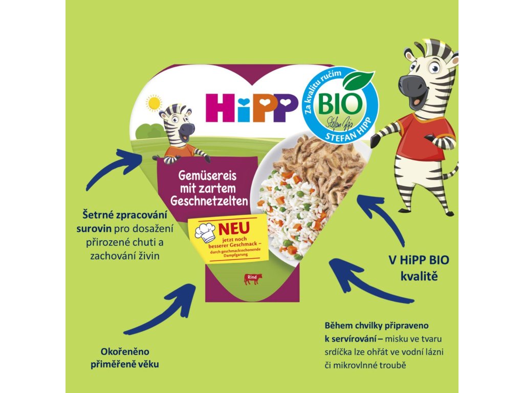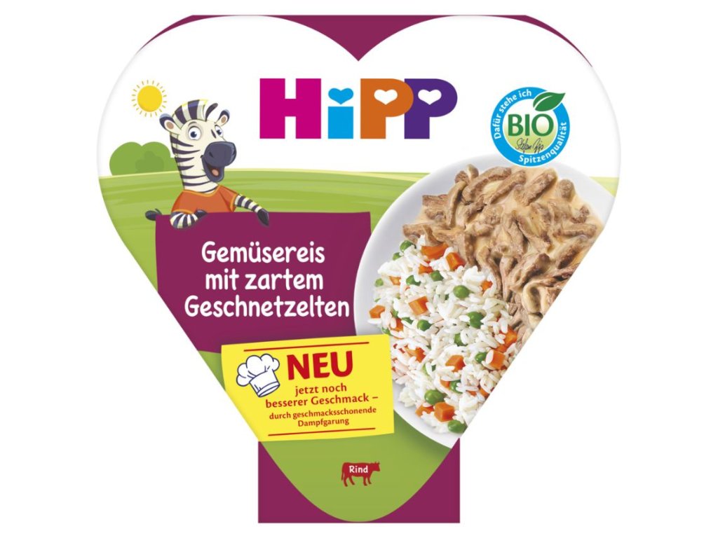 HiPP šéfkuchaři s láskou připravují receptury pro malé i větší gurmány. Pečlivě vybírají ty nejkvalitnější BIO suroviny a díky šetrnému zpracování zachovávají jejich přirozenou chuť, živiny a výjimečnou kvalitu. Pestrý výběr – hovězí, krůtí, ryba i bezmasé varianty – dětem umožňuje objevovat nové chutě. Praktické srdíčkové balení zajistí snadnou přípravu – stačí ohřát a podávat.