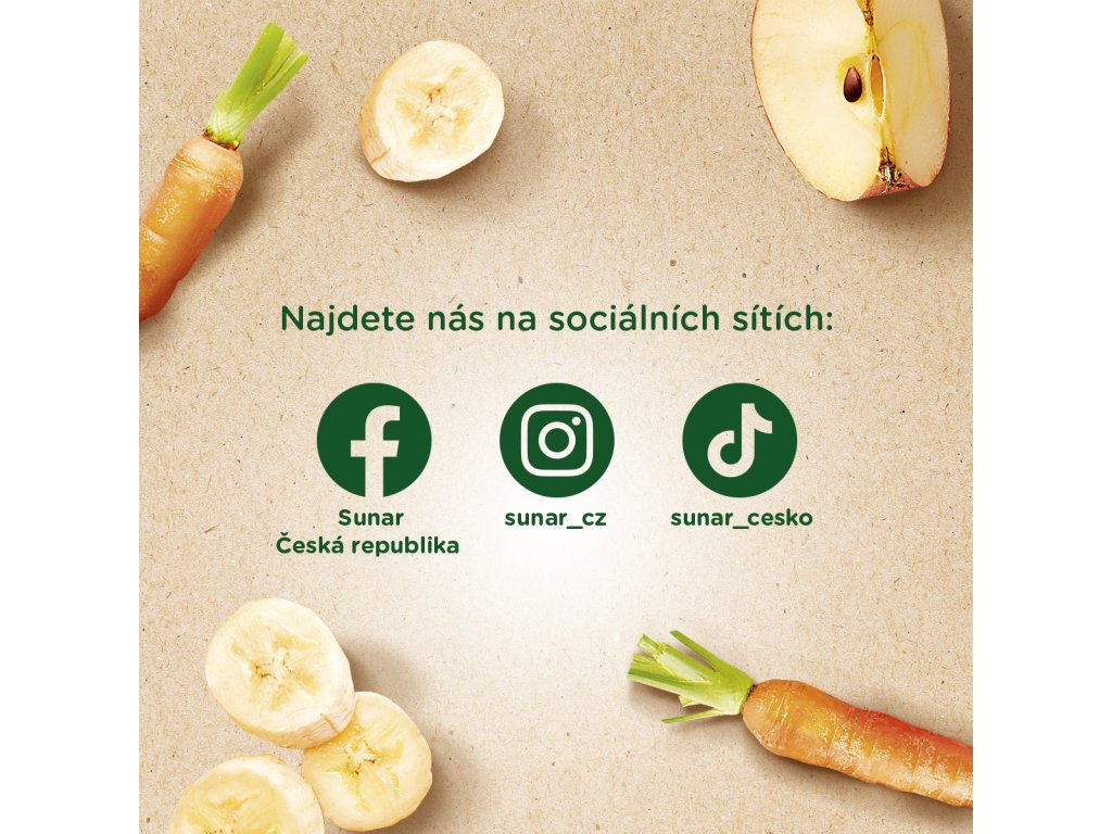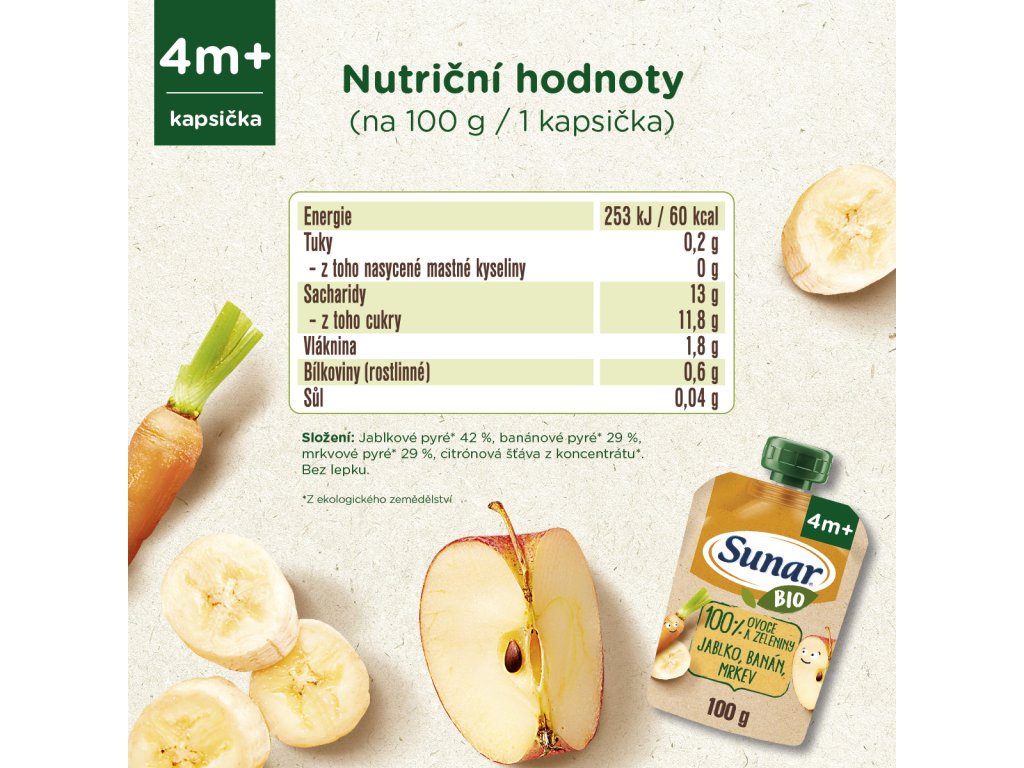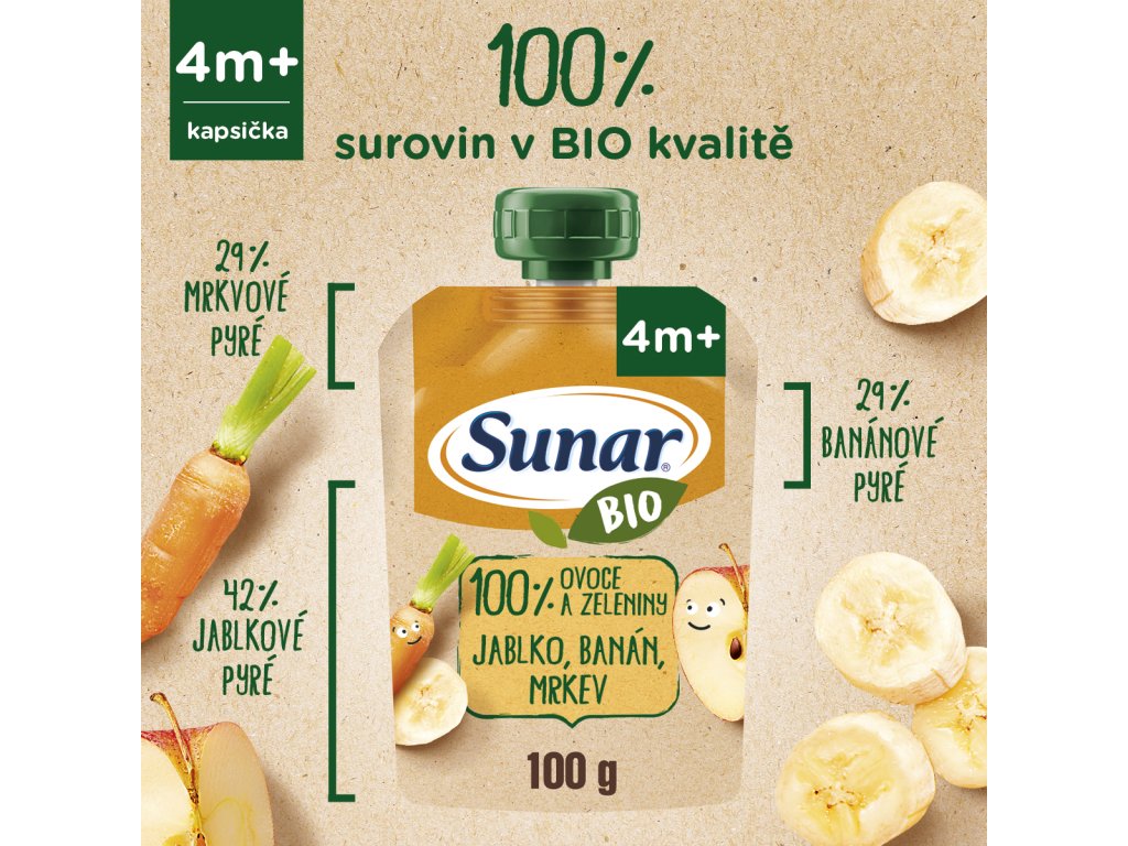 Sunar BIO kapsička jablko, banán, mrkev je plná 100% vyzrálého a šťavnatého ovoce a zeleniny v nejvyšší BIO Baby kvalitě. Je vhodná pro děti od ukončeného 4. měsíce věku. Neobsahuje přidaný cukr.