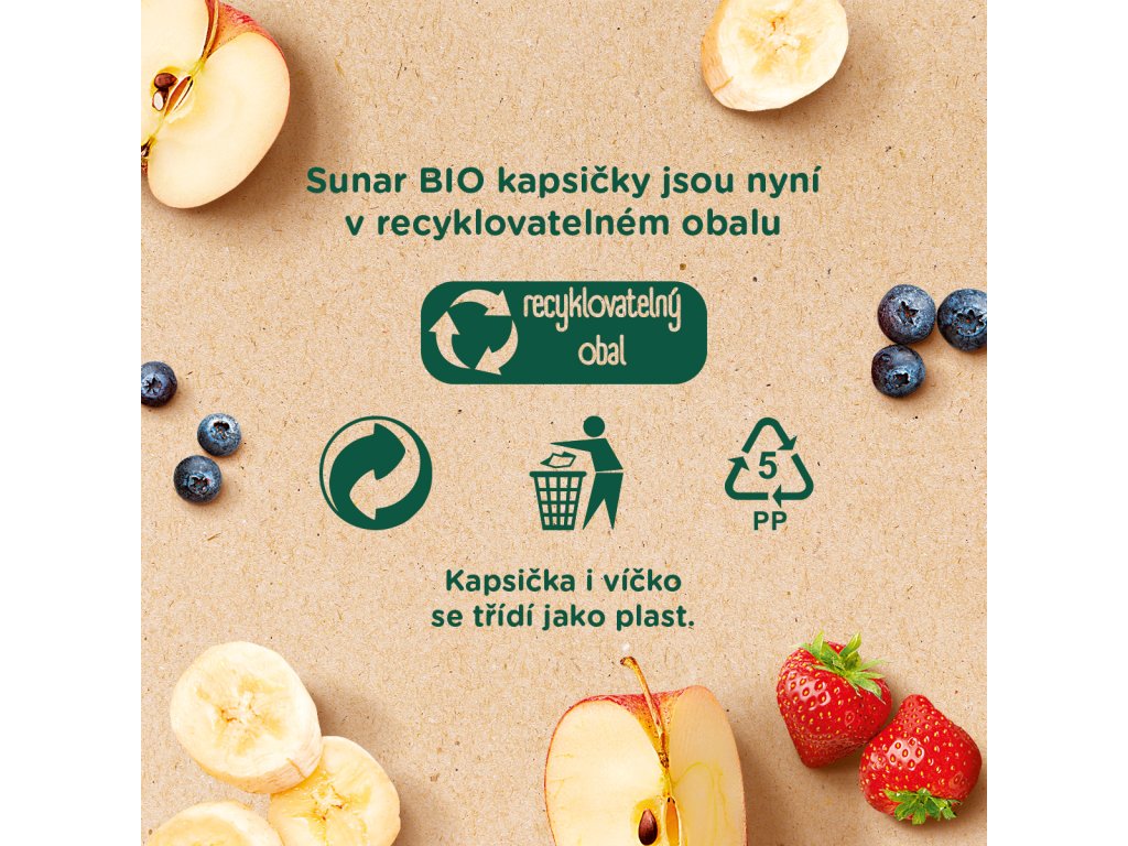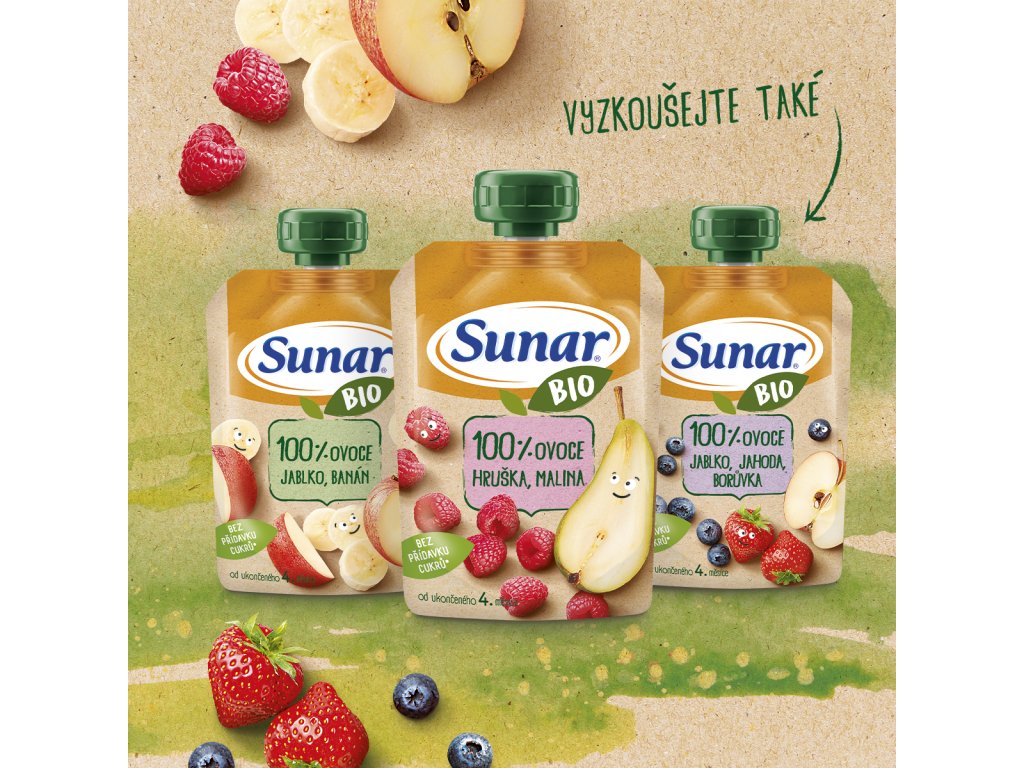 Sunar BIO je ovocná kapsička nabitá šťavnatým vyzrálým ovocem v BIO Baby kvalitě. Přesnídávka vhodná pro děti od ukončeného 4. měsíce věku, poslouží jako první příkrm při zavádění ovoce a zeleniny do stravy dítěte. Samozřejmostí je složení bez přidaného cukru, aromat a barviv.