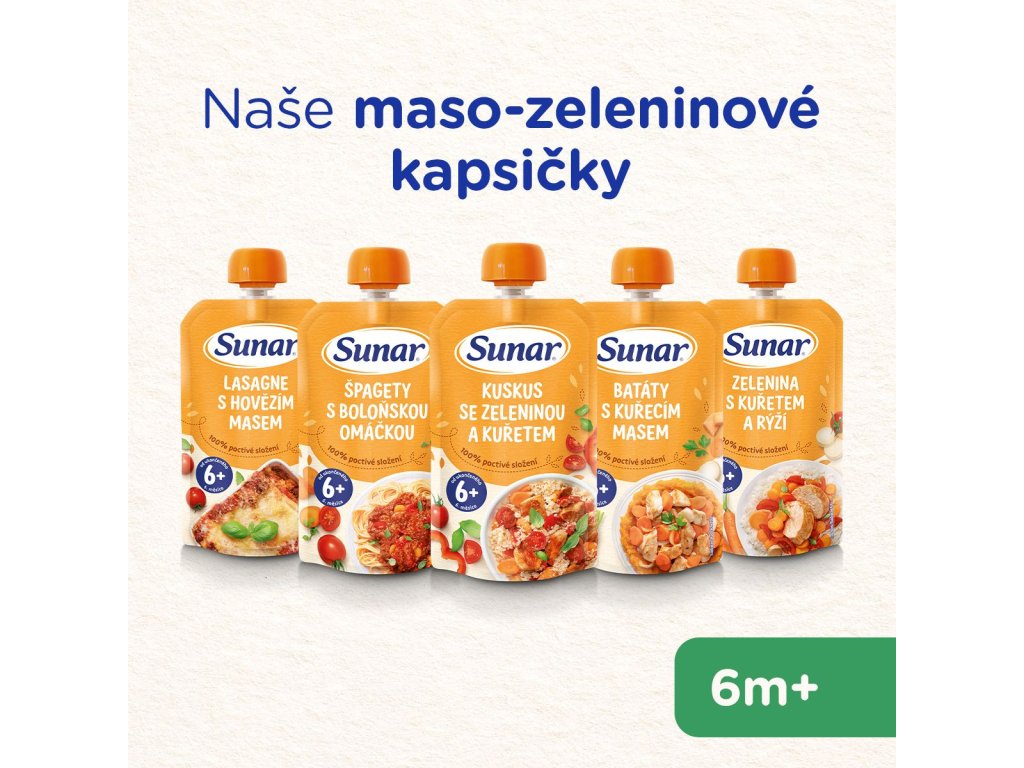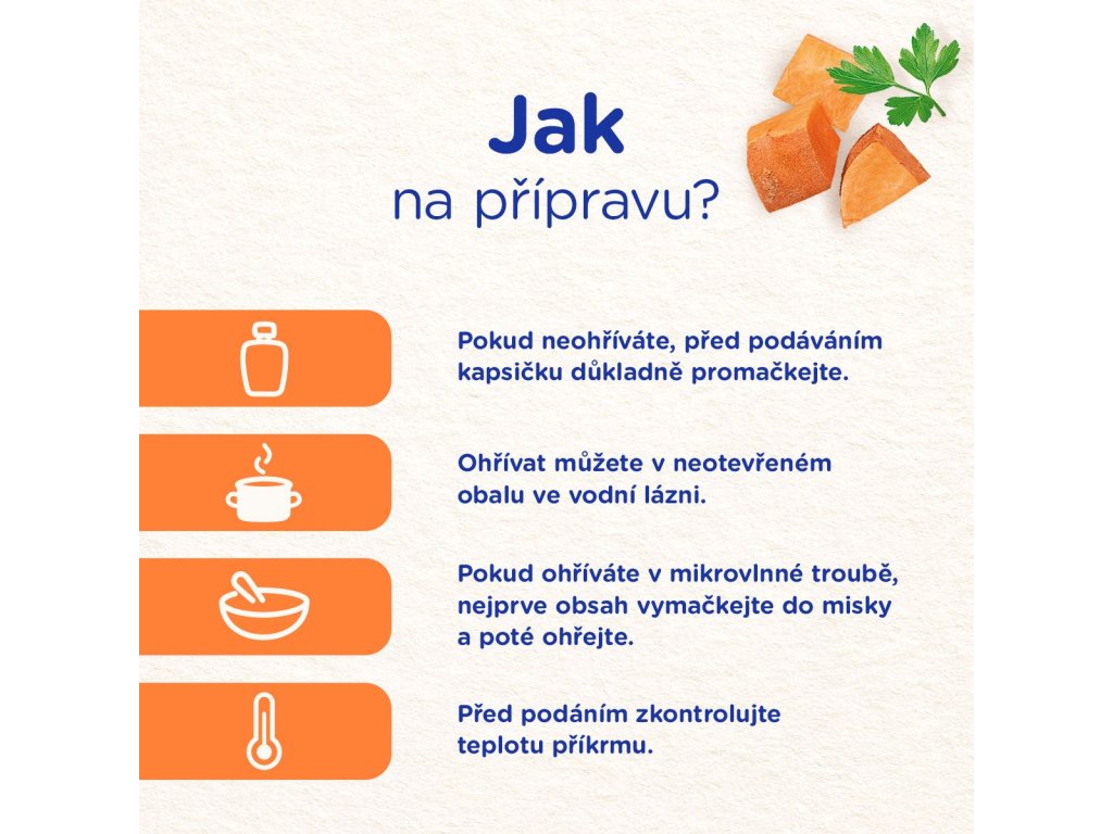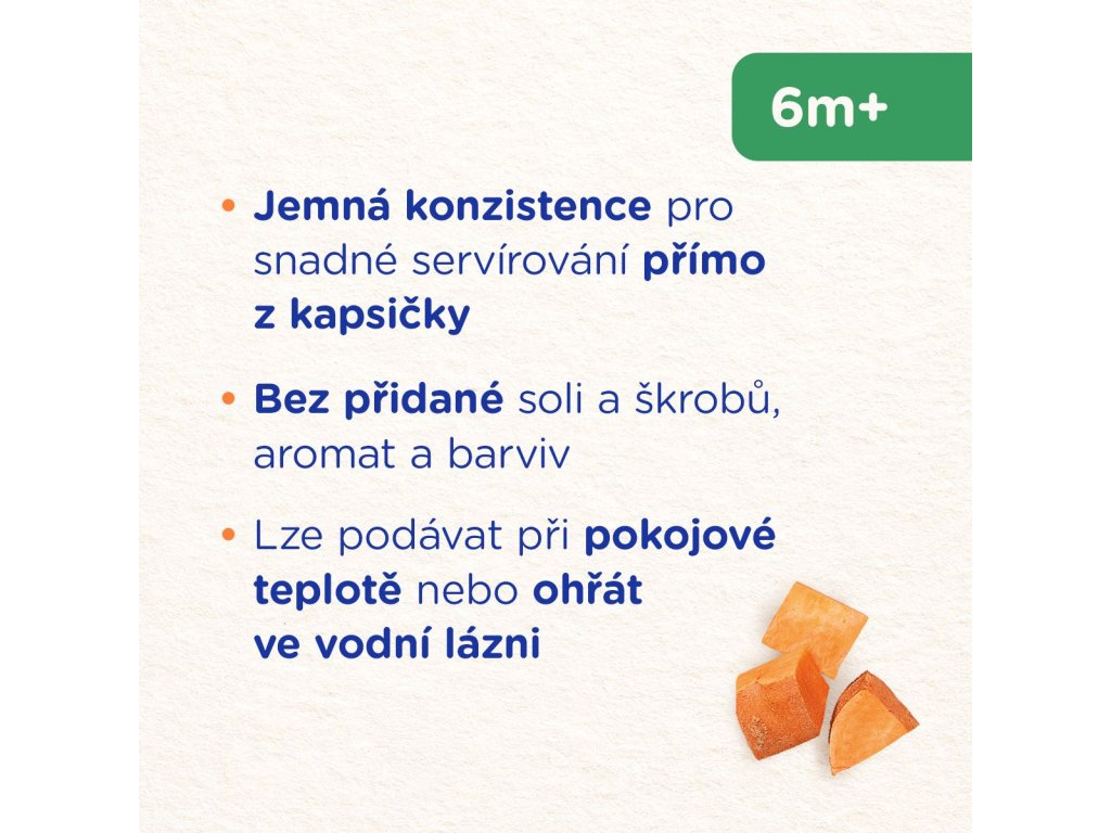 Sunar příkrm v sáčku batáty s kuřecím masem je vhodný pro děti od ukončeného 6. měsíce. Hotové jídlo v praktickém balení je chutné, vyvážené a syté jídlo s jemnou konzistencí a bez kousků. Pokrm je vhodný k obědu či večeři, kdy si na něm děti mohou pochutnat samy a trénovat tak zručnost a koordinaci pohybů. Díky svému praktickému balení a bezpečnostnímu uzávěru oceníte příkrm od značky Sunar v pohodlí domova i na cestách. Kapsička je určena k okamžité konzumaci nebo je možné ji ohřát ve vodní lázni.
