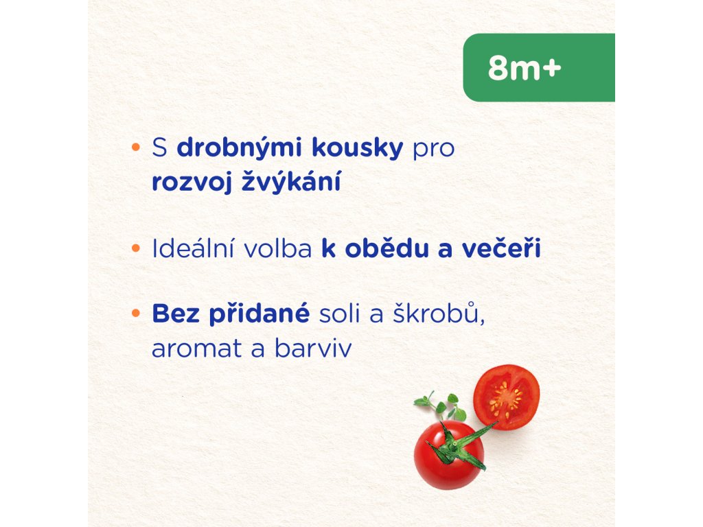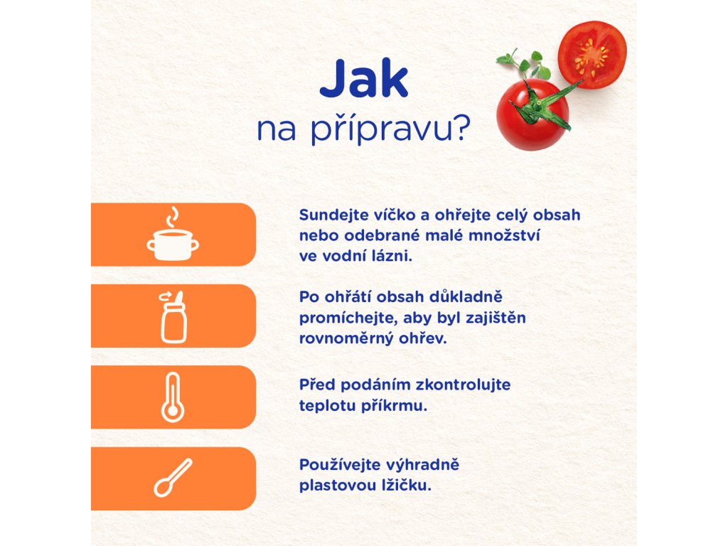 Při otevření musí víčko klapnout. Sundejte víčko a ohřejte celý obsah nebo odebrané malé množství ve vodní lázni. Nevařte! Po ohřátí obsah důkladně promíchejte, aby byl zajištěn rovnoměrný ohřev. Před podáním zkontrolujte teplotu příkrmu. Již jednou ohřáté a nespotřebované jídlo dále neuchovávejte. Nespotřebované neohřáté množství skladujte v uzavřeném obale v chladničce a spotřebujte do 24 hodin. Používejte výhradně plastovou lžičku. Je důležité dodržovat návod na přípravu, podmínky uchování a skladování, aby nedošlo k ohrožení zdraví dítěte.