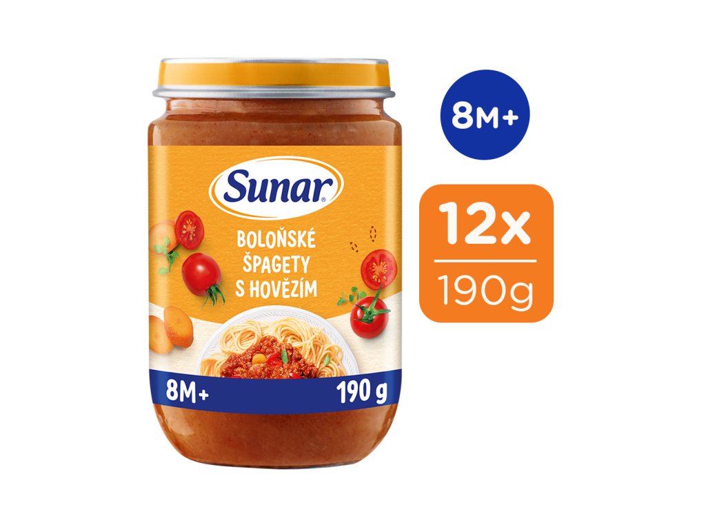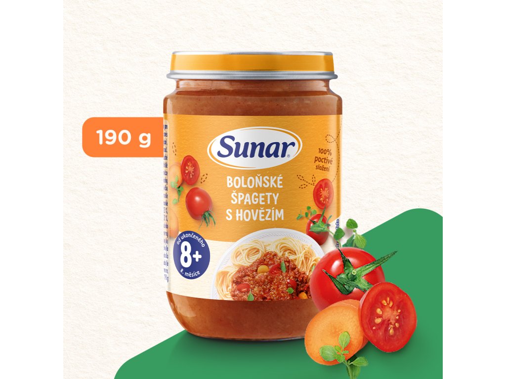 Sunar příkrm Boloňské špagety s hovězím masem je vhodný pro děti od ukončeného 8. měsíce. Během chvilky máte navařeno hravě a s chutí. Bez přidané soli, ze 100 % poctivých surovin v té nejvyšší baby kvalitě.