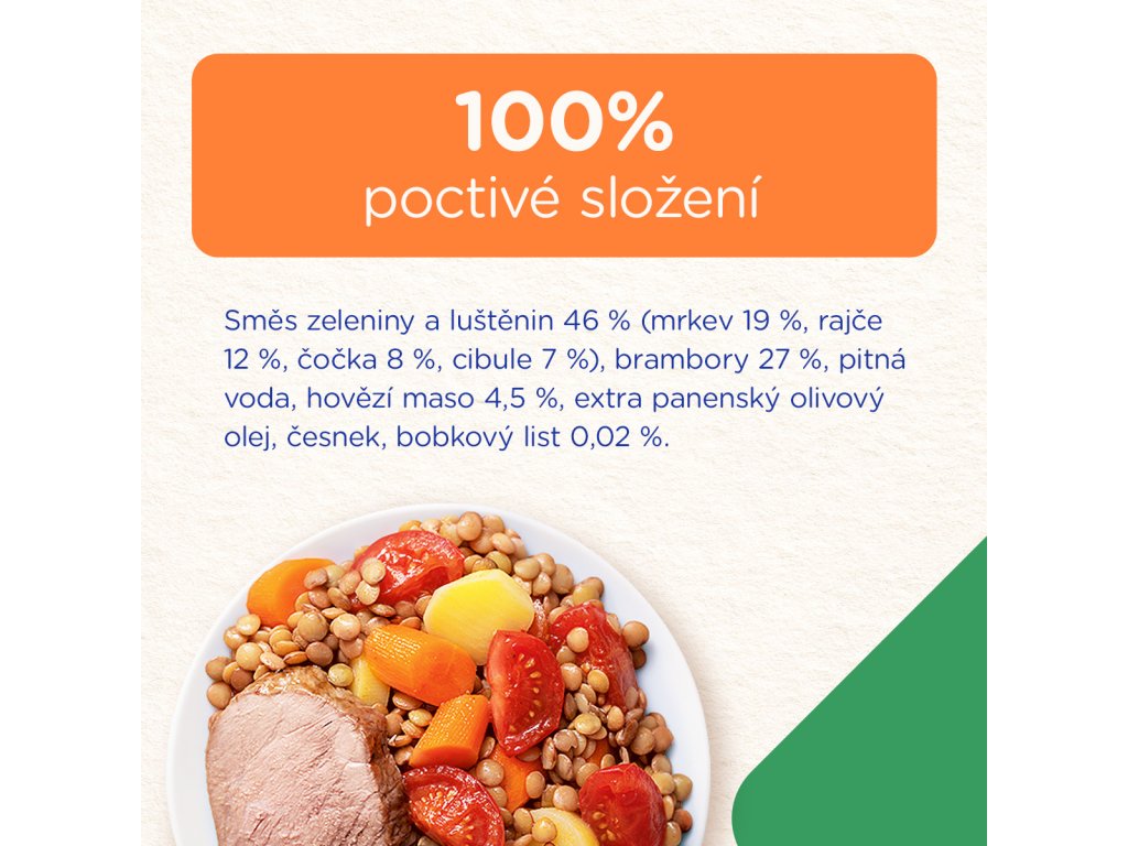 Složení: Směs zeleniny a luštěnin 46 % (mrkev 19 %, rajče 12 %, čočka 8 %, cibule 7% ), brambory 27 %, pitná voda, hovězí maso 4,5 %, extra panenský olivový olej, česnek, bobkový list 0,02 %.