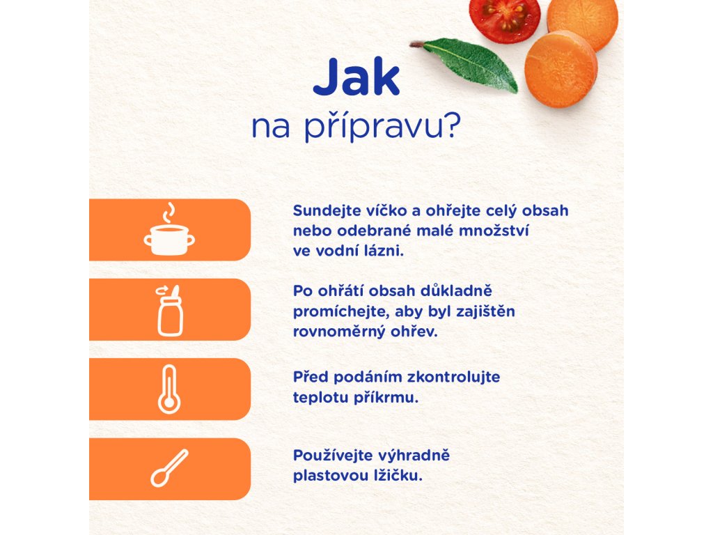 Při otevření musí víčko klapnout. Sundejte víčko a ohřejte celý obsah nebo odebrané malé množství ve vodní lázni. Nevařte! Po ohřátí obsah důkladně promíchejte, aby byl zajištěn rovnoměrný ohřev. Před podáním zkontrolujte teplotu příkrmu. Již jednou ohřáté a nespotřebované jídlo dále neuchovávejte. Nespotřebované neohřáté množství skladujte v uzavřeném obale v chladničce a spotřebujte do 24 hodin. Používejte výhradně plastovou lžičku. Je důležité dodržovat návod na přípravu, podmínky uchování a skladování, aby nedošlo k ohrožení zdraví dítěte.