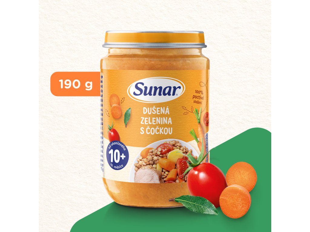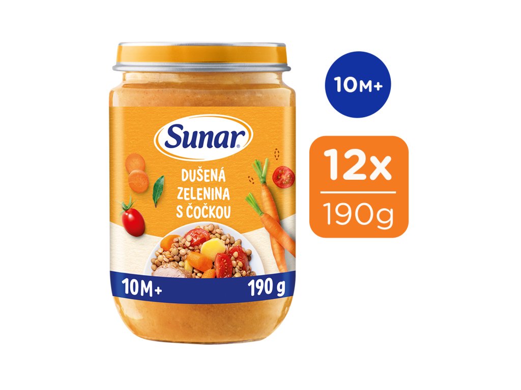 Sunar příkrm Dušená zelenina s čočkou je ideální volbou k obědu nebo večeři pro děti od ukončeného 10. měsíce. 100 % poctivých ingrediencí. Bez přidané soli, ze surovin v té nejvyšší baby kvalitě. Navařeno hravě a s chutí.