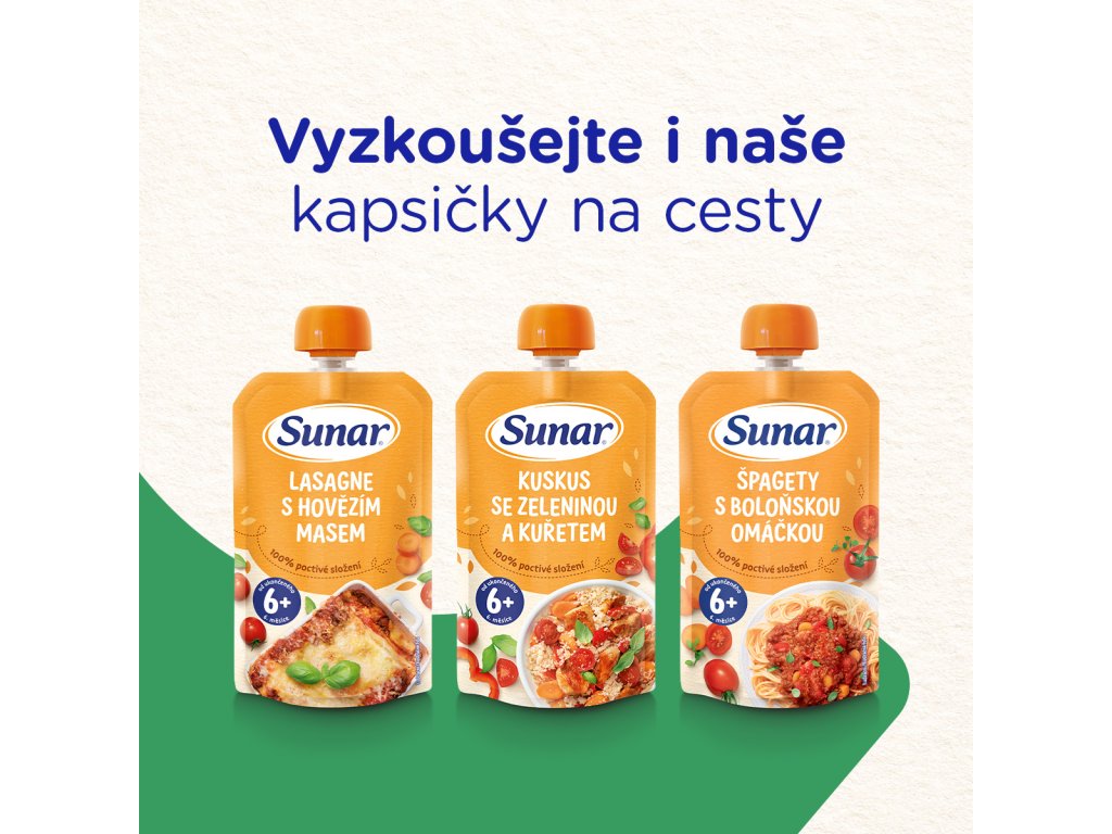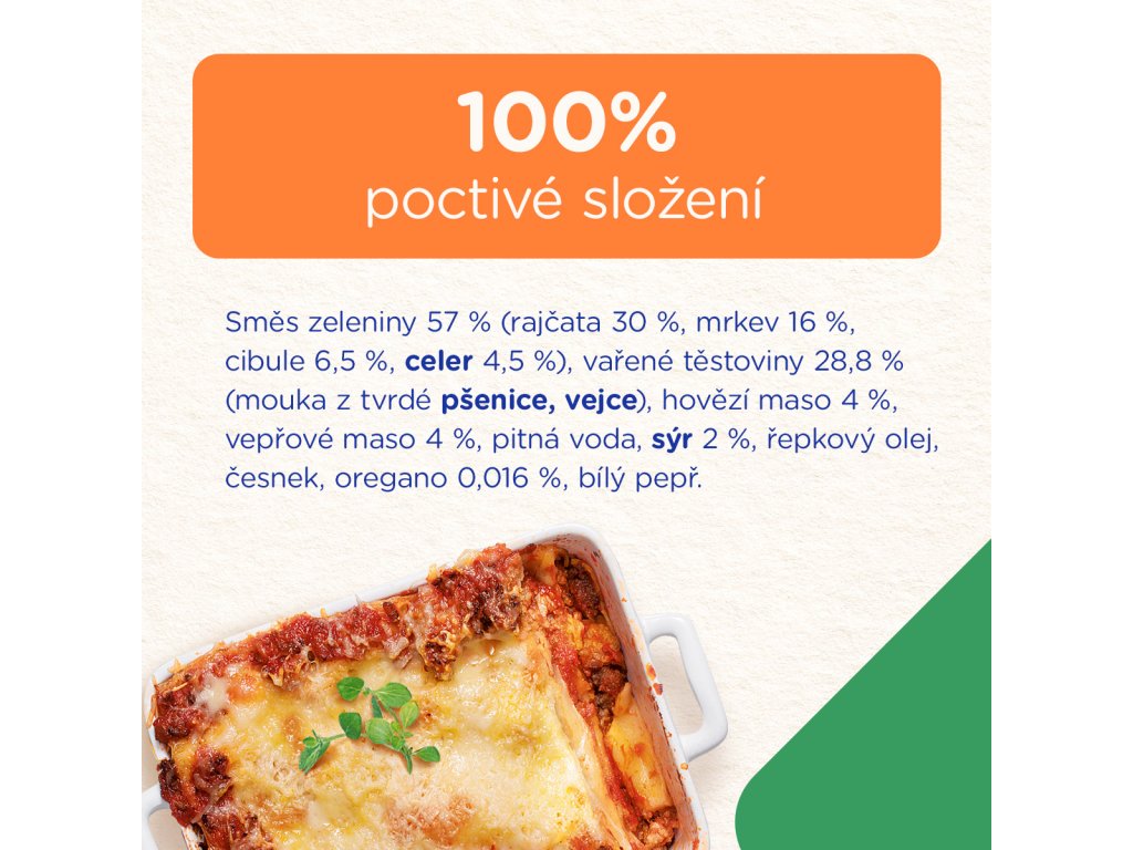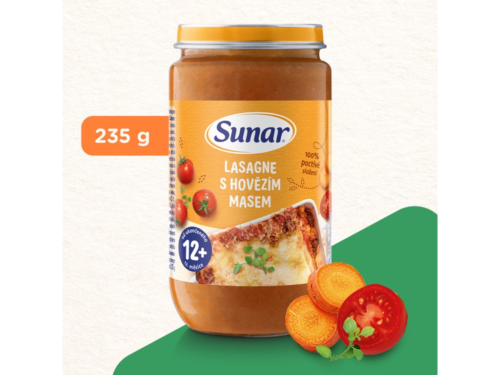 Sunar příkrm Lasagne s hovězím je ideální volbou k obědu nebo večeři pro děti od ukončeného 12. měsíce. 100 % poctivé složení. Bez přidané soli, ze surovin v té nejvyšší baby kvalitě. Navařeno hravě a s chutí.