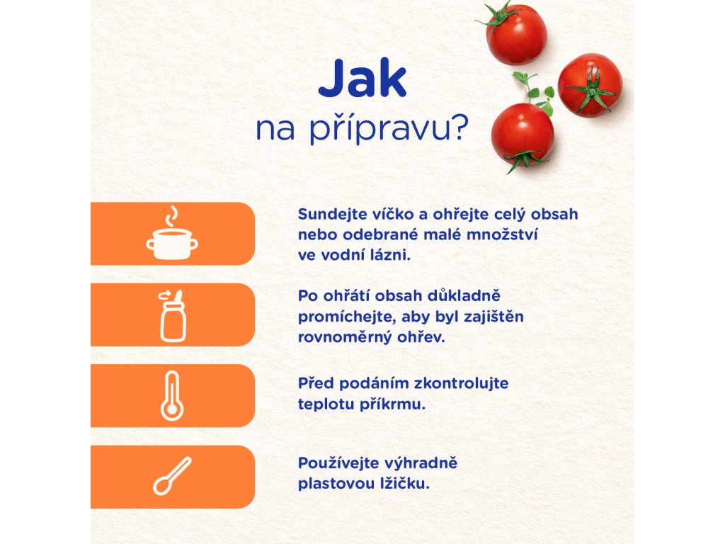 Při otevření musí víčko klapnout. Sundejte víčko a ohřejte celý obsah nebo odebrané malé množství ve vodní lázni. Nevařte! Po ohřátí obsah důkladně promíchejte, aby byl zajištěn rovnoměrný ohřev. Před podáním zkontrolujte teplotu příkrmu. Již jednou ohřáté a nespotřebované jídlo dále neuchovávejte. Nespotřebované neohřáté množství skladujte v uzavřeném obale v chladničce a spotřebujte do 24 hodin. Používejte výhradně plastovou lžičku. Je důležité dodržovat návod na přípravu, podmínky uchování a skladování, aby nedošlo k ohrožení zdraví dítěte.