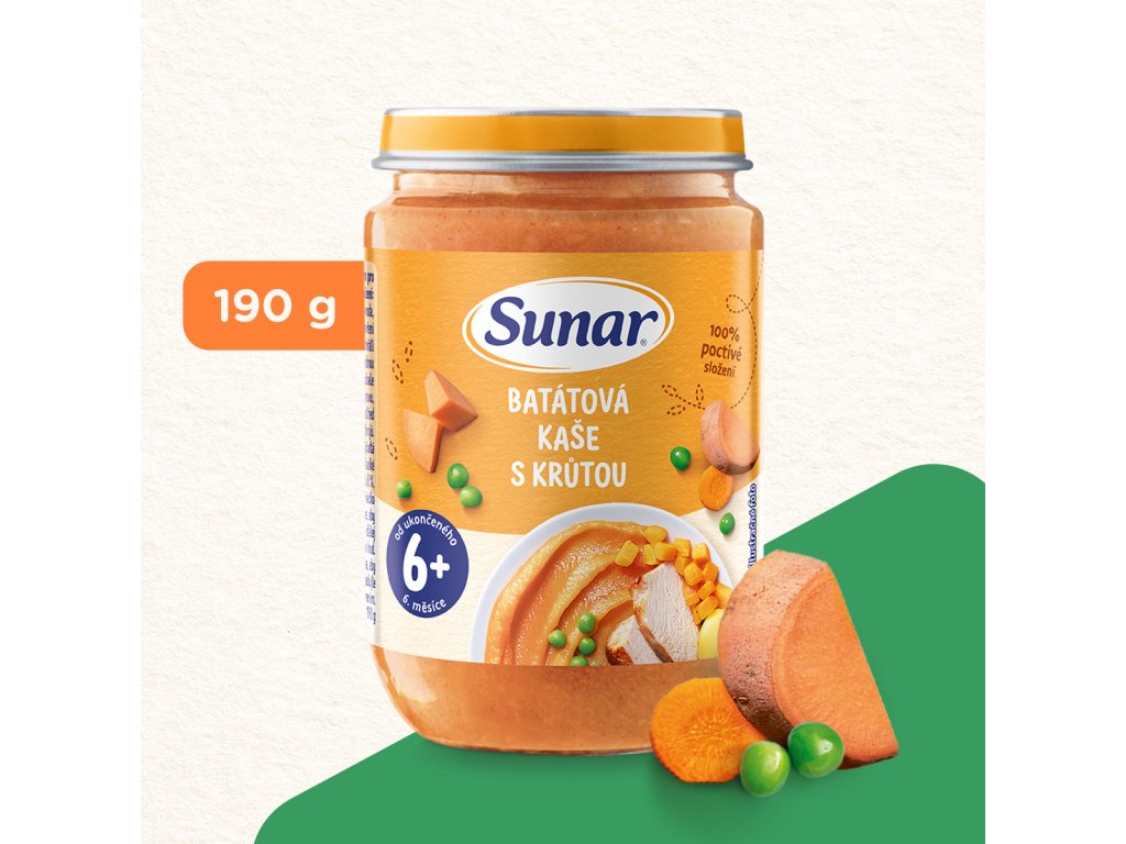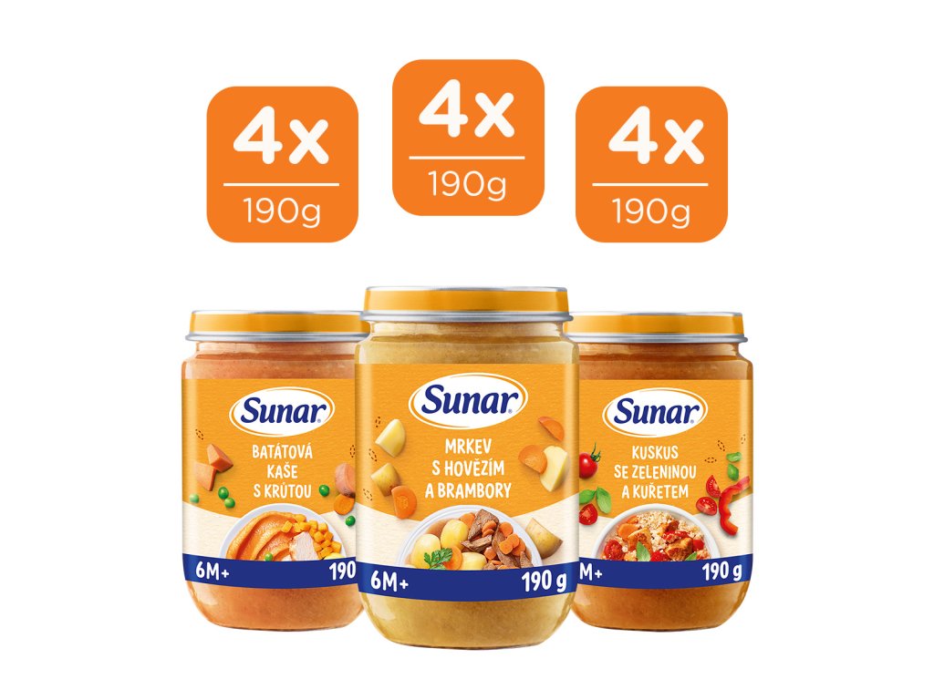 Sunar příkrm Kuskus se zeleninou a kuřetem, Sunar příkrm Batátová kaše s krůtím masem, Sunar příkrm Mrkev s hovězím a brambory