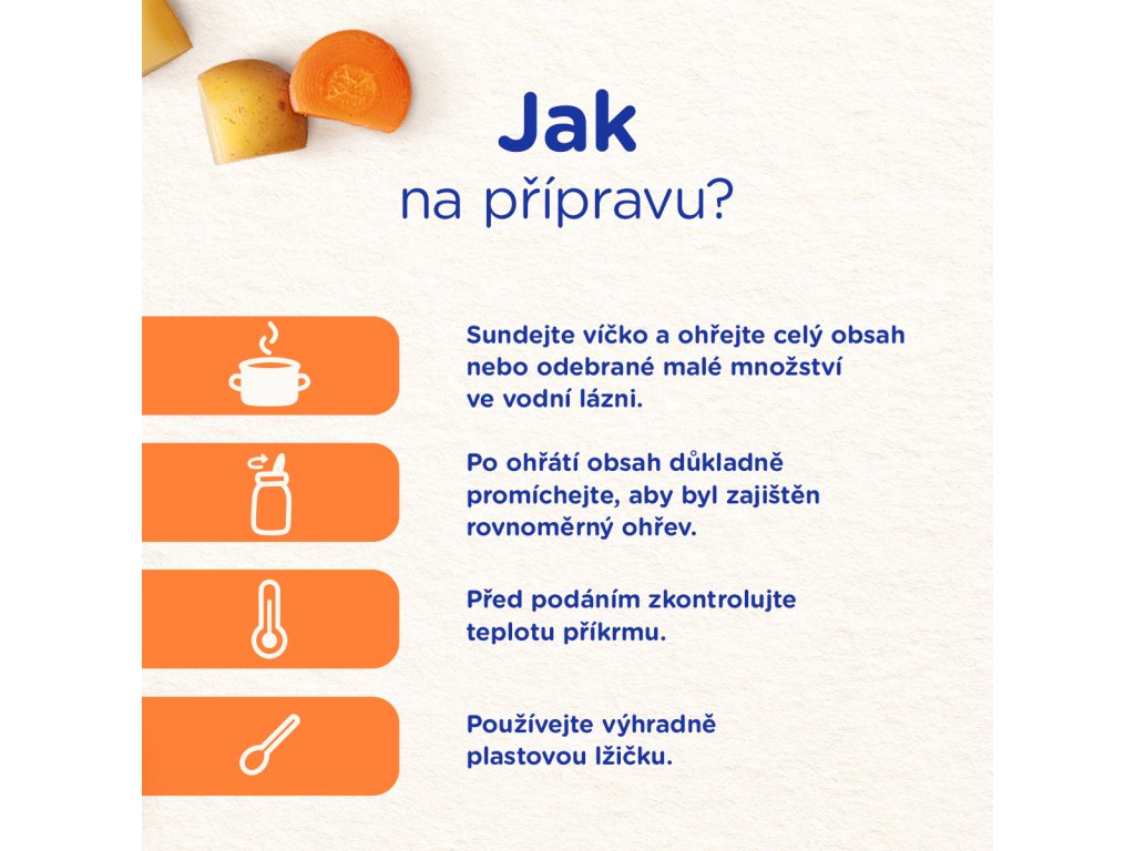 Při otevření musí víčko klapnout. Sundejte víčko a ohřejte celý obsah nebo odebrané malé množství ve vodní lázni. Nevařte! Po ohřátí obsah důkladně promíchejte, aby byl zajištěn rovnoměrný ohřev. Před podáním zkontrolujte teplotu příkrmu. Již jednou ohřáté a nespotřebované jídlo dále neuchovávejte. Nespotřebované neohřáté množství skladujte v uzavřeném obale v chladničce a spotřebujte do 24 hodin. Používejte výhradně plastovou lžičku. Je důležité dodržovat návod na přípravu, podmínky uchování a skladování, aby nedošlo k ohrožení zdraví dítěte.