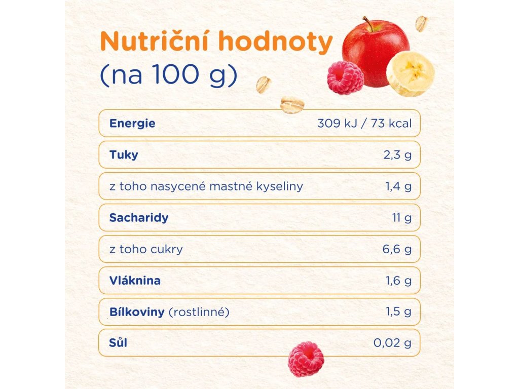 Složení: Směs ovoce 59% (jablečné pyré 39 %, banánové pyré 12 %, malinové pyré 8 %), pitná voda, JOGURT 12 %, OVESNÉ vločky 5 %, SMETANA, citronová šťáva z koncentrátu.