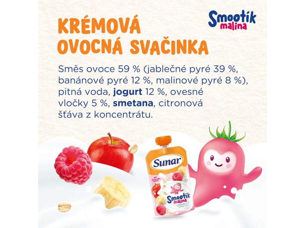 Sunar Smootík malina, jogurt, ovesné vločky 120 g je krémová ovocná svačinka, která potěší malé i větší děti. Snoubení jemného jogurtu s ovocem tvoří krémovou svačinku, která je přirozeně bez přidaného cukru*. Ovesné vločky dodávají potřebnou energii na dovádění. Kapsička Sunar Smootík je skvělou dopolední nebo odpolední svačinkou pro malé dobrodruhy, kteří mají rádi mléčnou chuť a rádi objevují nové dobroty.