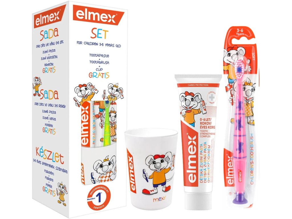 Elmex dětský set zubní pasta, 2x zubní kartáček a kelímek