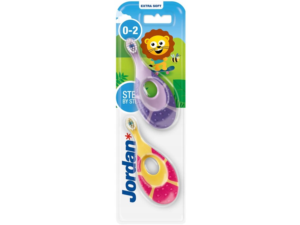 Jordan dětský zubní kartáček s kousátkem je vhodný pro první zoubky až do 2 let věku. Malá hlavice s extra měkkými vlákny, krátký krk kartáčku a široké držátko zabraňuje hlubšímu zavedení do úst a krku.