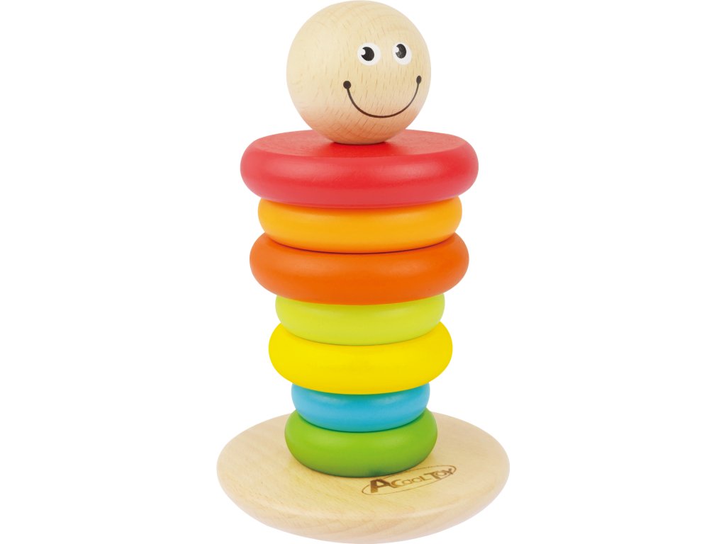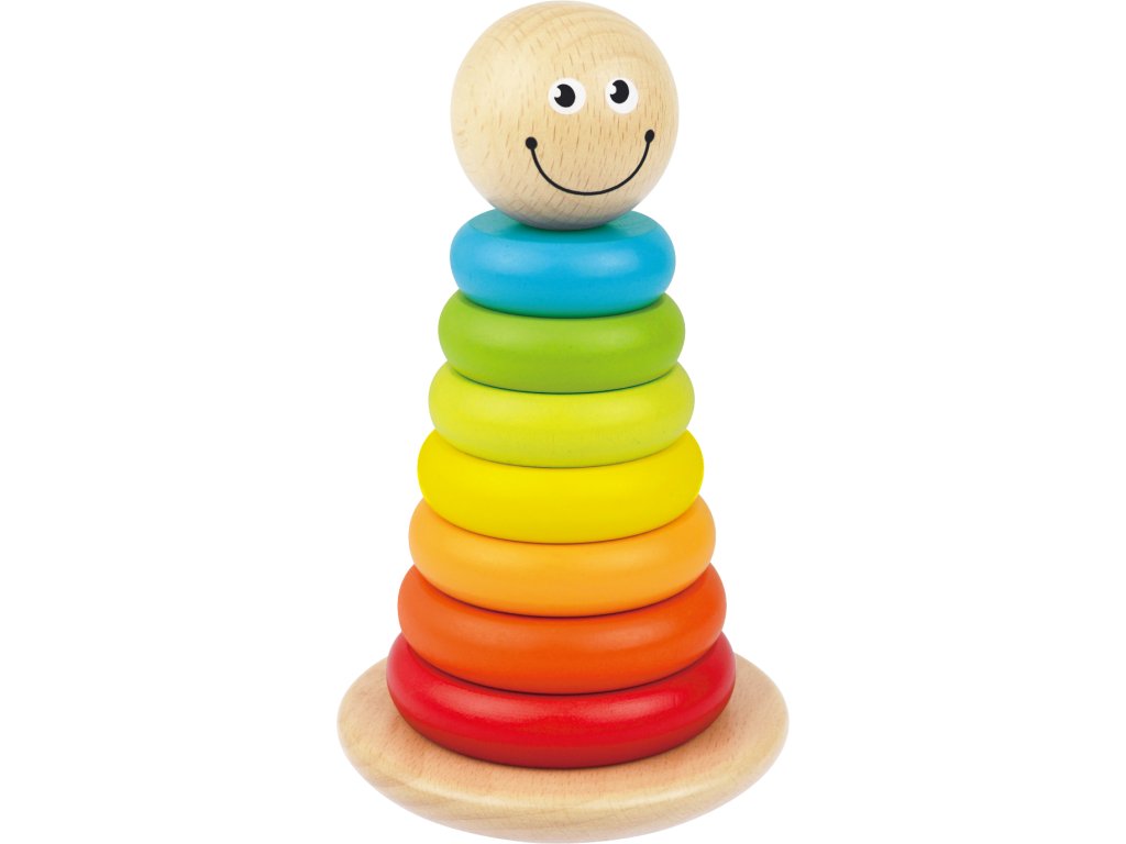 Dřevěná pyramida se skládá ze 7 barevných kroužků a smějící hlavičky.