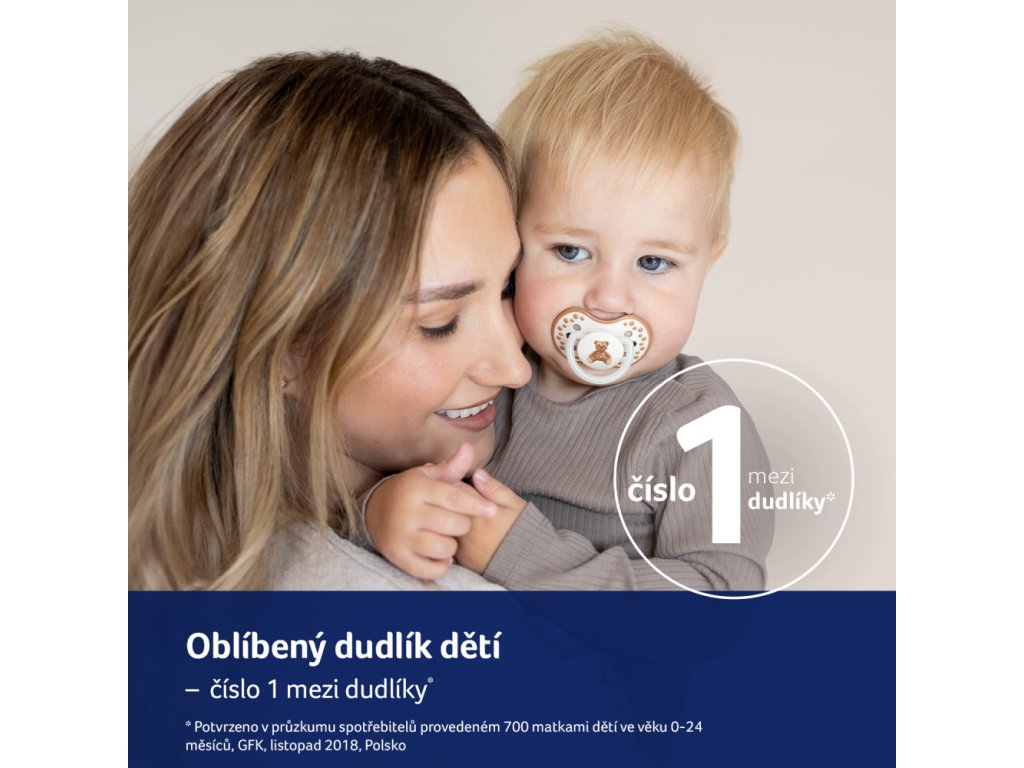 - OBLÍBENÝ DĚTSKÝ DUDLÍK - Potvrzeno ve spotřebitelském průzkumu provedeném na skupině 700 matek dětí ve věku 0-24 měsíců, GfK, listopad 2018.