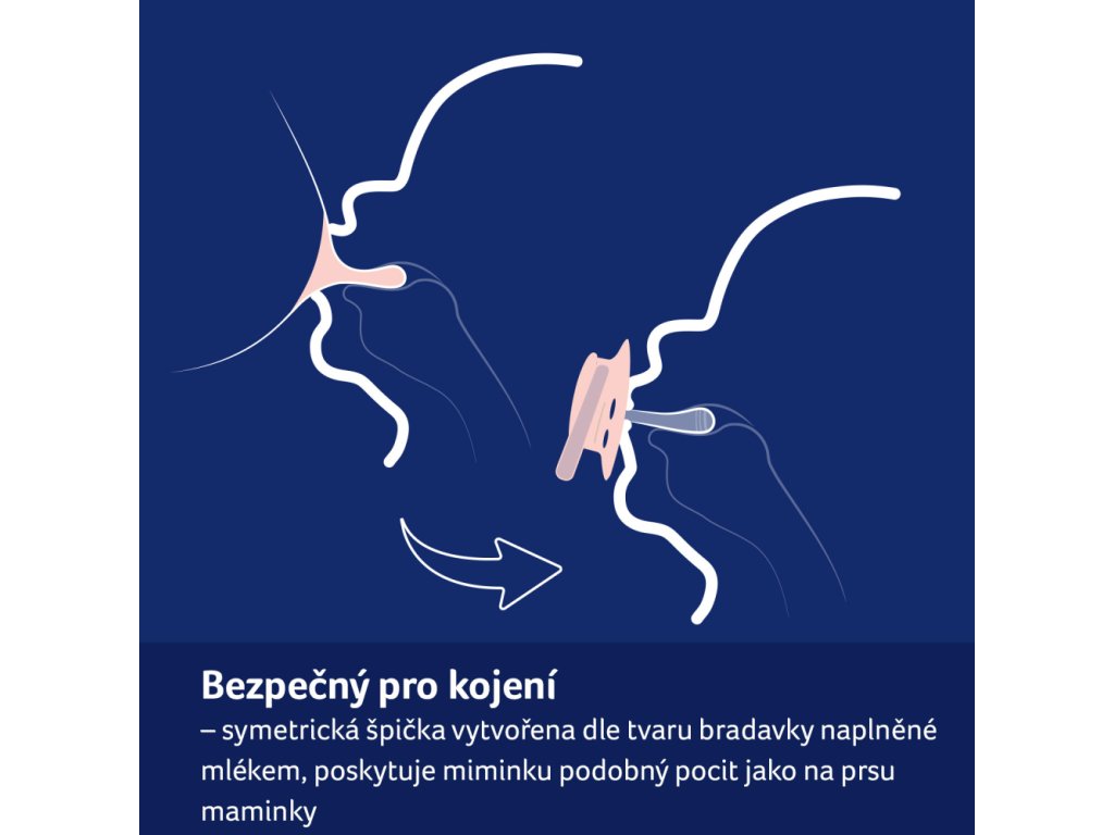 - BEZPEČENÝ PRO KOJENÍ - Symetrický tvar špičky vychází z tvaru bradavky naplněné mlékem, která poskytuje miminku známý pocit podobný pocitu z prsu.
