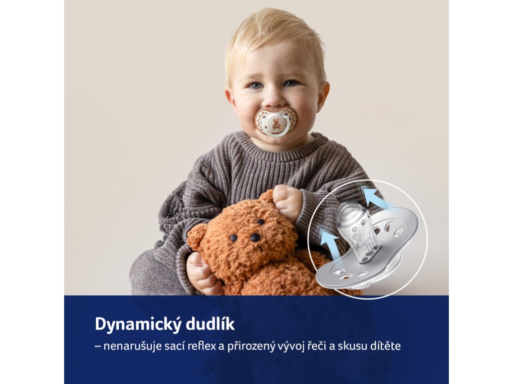 Dynamický dudlík TEDDY LOVE navíc nenarušuje vývoj řeči a kousání*. Špička je zploštělá a krk je tak tenký, že umožňuje dítěti volně zavírat ústa a správně pracovat dásněmi při sání a poskytuje dostatek prostoru v ústech pro práci jazyka, což snižuje riziko malokluze a vad řeči *.