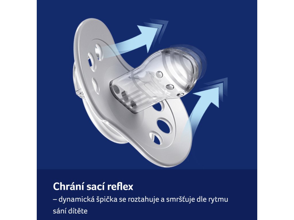 - CHRÁNÍ SACÍ REFLEX - Dynamická špička je vyrobena z nestejnorodých vrstev silikonu, takže se prodlužuje a smršťuje v závislosti na rytmu sání dítěte.