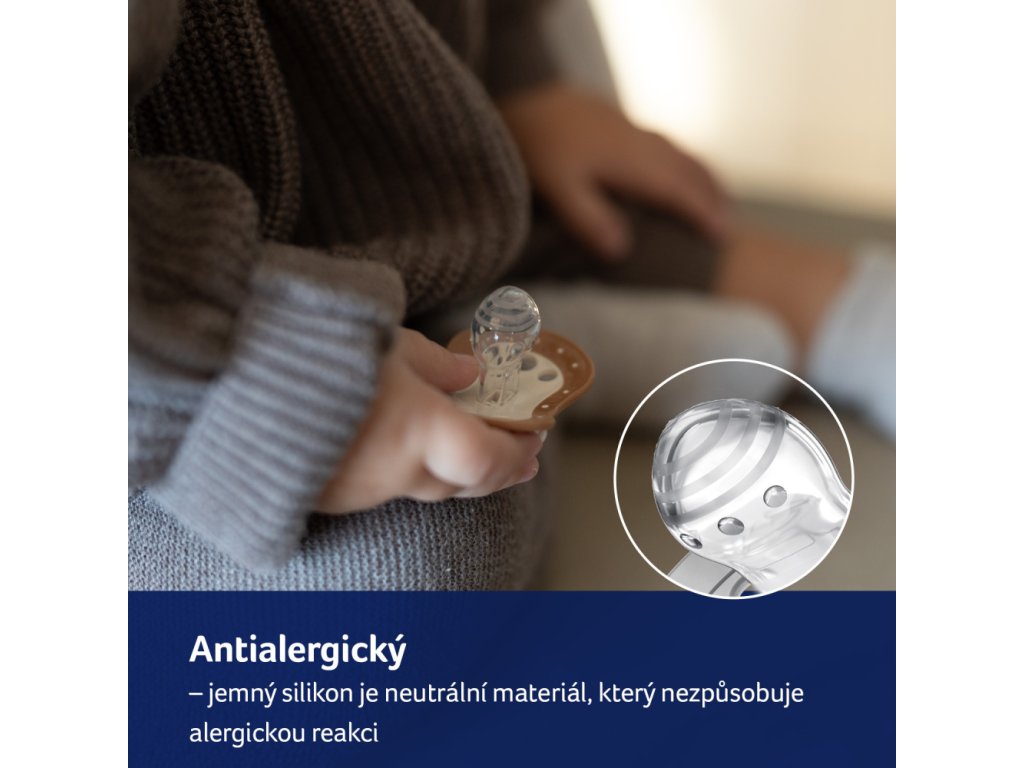 - ANTIALERGICKÝ - Jemný silikon v dudlíku je pro miminko neutrálním materiálem, nevyvolává alergické reakce, je bez chuti a zápachu, což je obzvláště důležité v této fázi, když je dítě citlivé na vnější podněty.