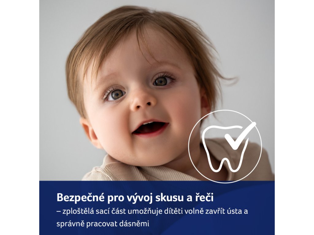 - BEZPEČNÝ PRO VÝVOJ SKUSU A ŘEČI - Dynamická špička se zploštělým koncem se při sání dítěte natáhne a poskytuje tak dostatek prostoru v ústech pro práci jazyka a zamezuje tak vzniku křivých zubů (malookluze).