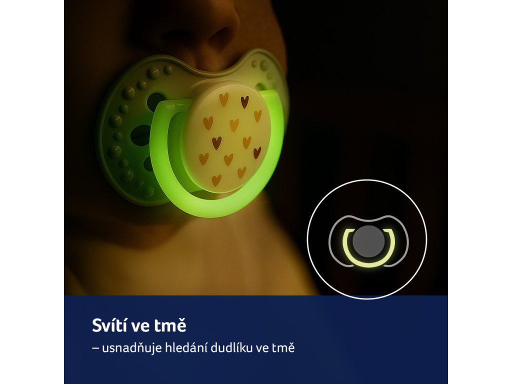 - SVÍTÍ VE TMĚ - Úchytka dudlíku svítí ve tmě, což usnadňuje jeho hledání v noci.