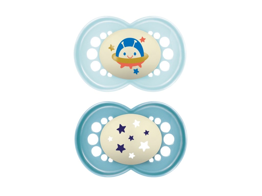 Dudlíky MAM Original Night jsou speciálně vyvinuty pro noční použití – knoflík dudlíku ve tmě svítí, takže ho rodiče i děti mohou snadno nalézt i v noci.