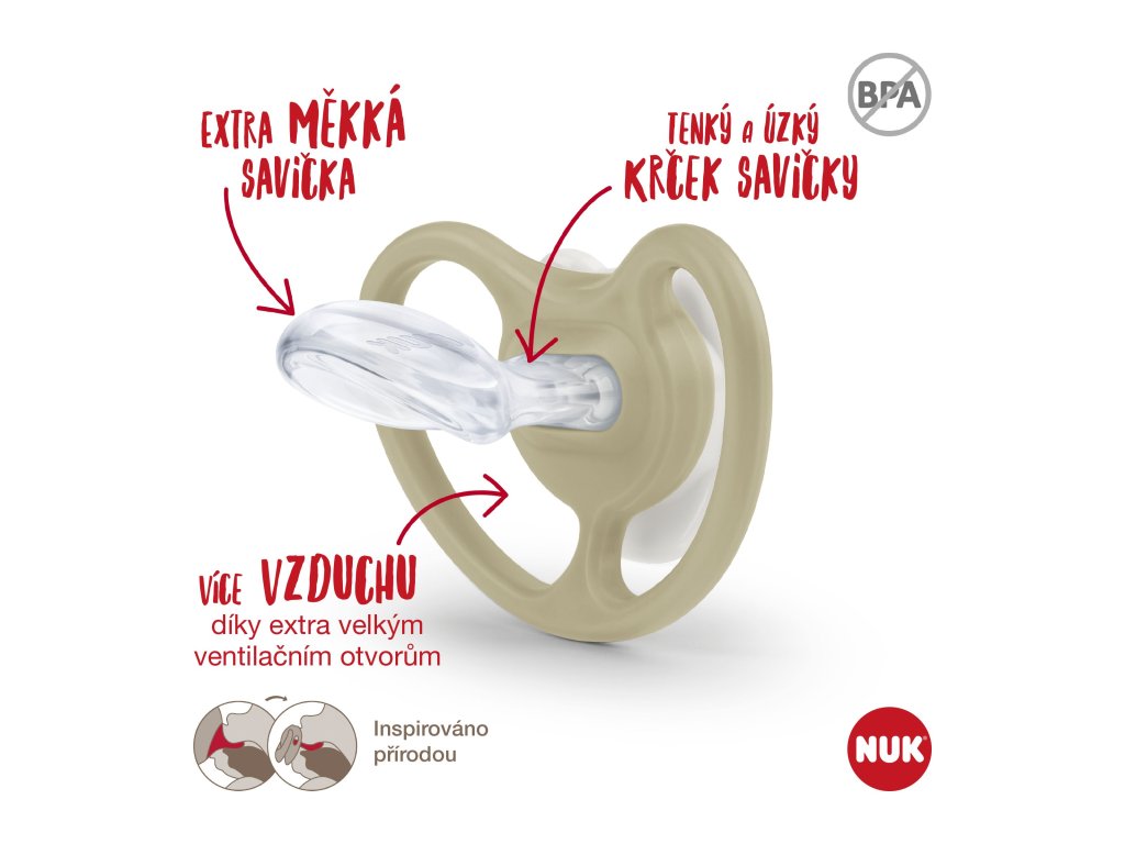 Silikonový dudlík NUK Space: umožňuje citlivé dětské pokožce dýchat.