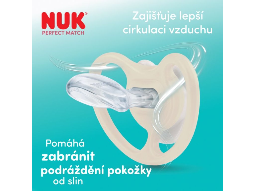 Dudlík NUK Perfect Match Air je speciálně navržen tak, aby miminko uklidnil a zároveň chránil jeho citlivou pokožku. Díky extra velkým ventilačním otvorům umožňuje maximální proudění vzduchu kolem úst, čímž pomáhá snižovat vlhkost a předcházet opruzeninám od slin – ideální volba pro miminka s citlivou pokožkou.