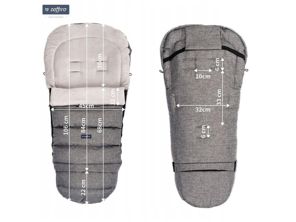 Lze je použít v hlubokých kočárcích, kočárcích, autosedačkách i jako spacák na sáňky. Vícebodové otvory pro bezpečnostní pásy umožňují bezpečné připoutání dítěte. Nepromokavý vnější materiál představuje spolehlivou ochranu před větrem, deštěm a sněhem. Úplně odnímatelná přikrývka je velmi užitečná při vkládání dítěte do spacáku nebo když potřebujete rychle se zbavit další vrstvy (např. při vstupu z dvora do místností).