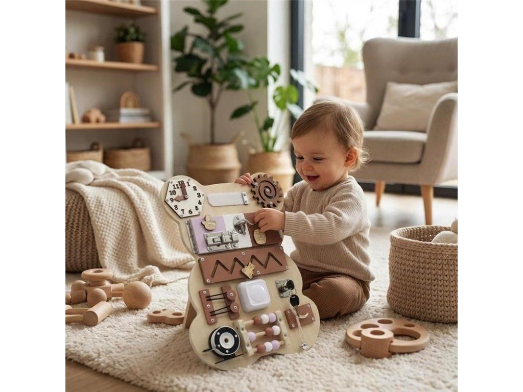 Dřevěná manipulační tabule Busy Board ve tvaru medvídka zabaví děti na dlouhé hodiny a zároveň podporuje jejich přirozený vývoj. Díky kombinaci různých prvků si dítě procvičuje jemnou motoriku, trpělivost i logické myšlení – a to zábavnou a bezpečnou formou.