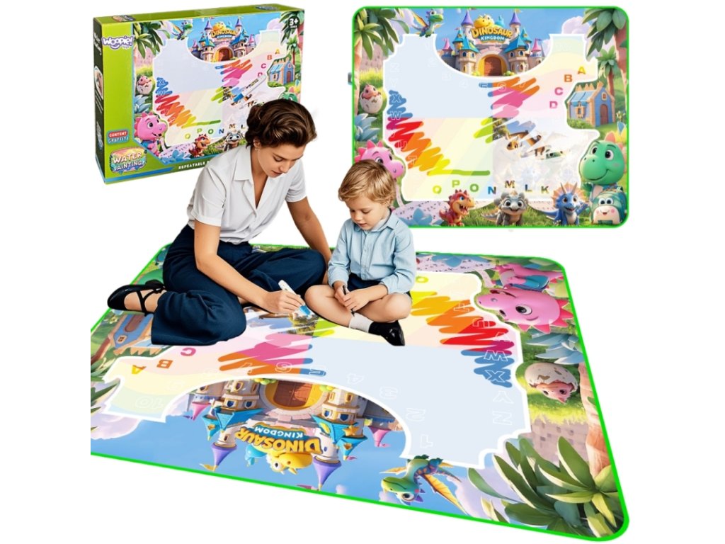 Tato kouzelná velká vodní podložka od Woopie je perfektním způsobem, jak si užít kreativní hru bez nepořádku . Jednoduše naplňte fixy vodou a barvy se na podložce kouzelně objeví! Jakmile podložka zaschne, kresba zmizí a vy můžete začít znovu. Je to skvělý způsob, jak nechat své dítě rozvíjet umělecké dovednosti bez rizika zašpinění oblečení, nábytku nebo stěn. Tato podložka s motivem dinosaura a hradu uvede vaše dítě do fantastického světa kreslení. Sada obsahuje řadu doplňků , jako jsou fixy na vybarvování a houbičková razítka pro vytváření dalších tvarů. Velká velikost podložky podporuje společné hraní se sourozenci nebo rodiči. Výrobek je bezpečný a opakovaně použitelný.