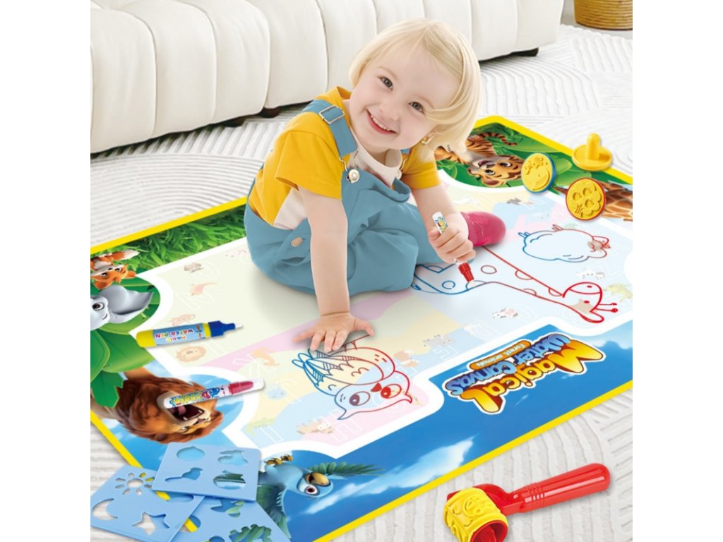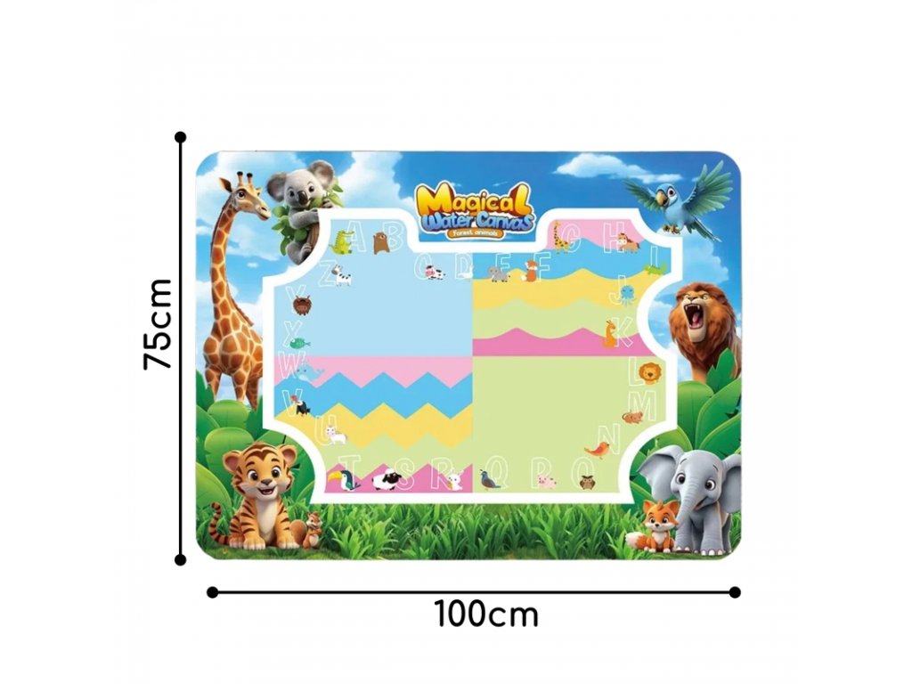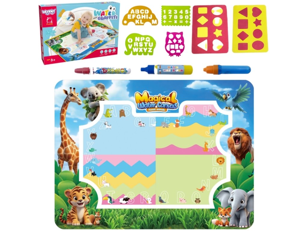 Podložka na malování vodou WOOPIE je vzdělávací výtvarná sada pro děti od 3 let . Jednoduše naplňte přiložené fixy čistou vodou a objevujte barvy, písmena, čísla a tvary bez použití inkoustu nebo barev. Kresby se krátce objeví a po zaschnutí zmizí, což vás vybízí k dalšímu hraní. Velký formát 100x75 cm poskytuje prostor pro společnou tvorbu a hravá grafika zvířat z džungle podporuje učení hrou.