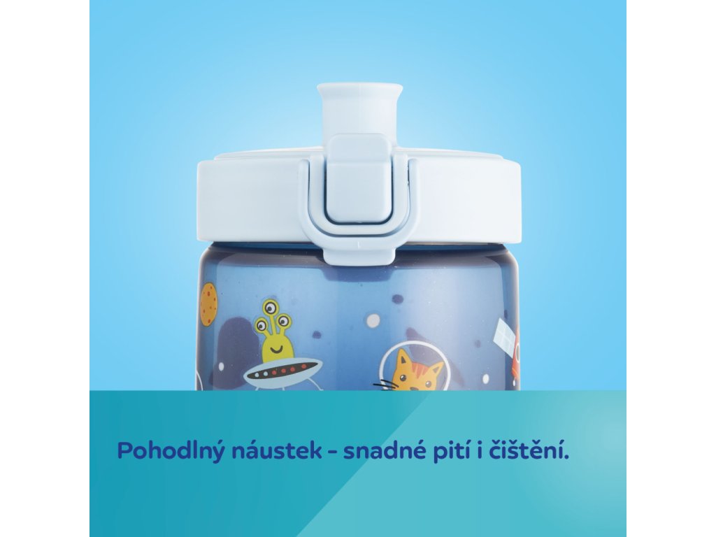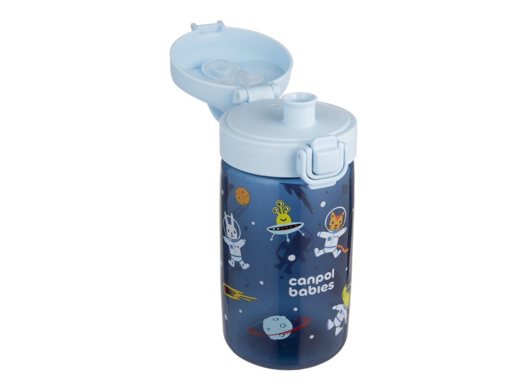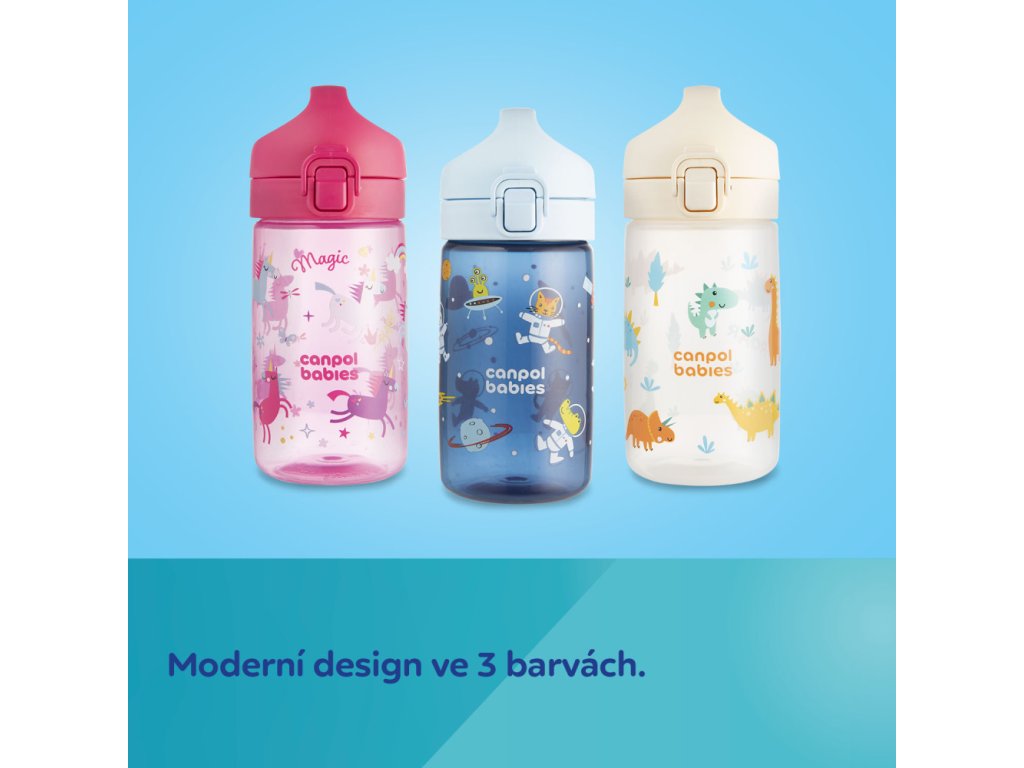 Jednoduché ovládání jednou rukou – jedno kliknutí a pití je připraveno! Náustek je navržen tak, aby se snadno čistil i skladoval – bez brček a závaží. Láhev je vhodná do myčky nádobí (doporučujeme ekologické tablety do myčky Canpol babies – k.č. 1/502, bez barviv a parfemace).
