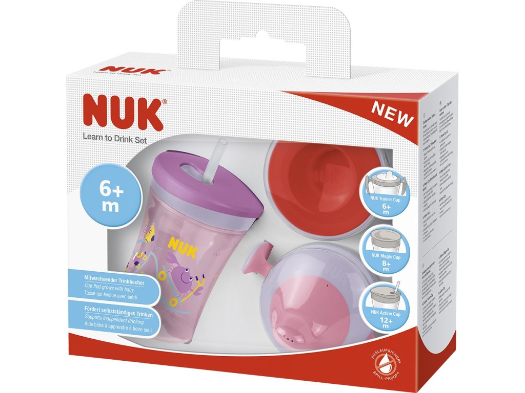 - 1x nástavec na hrneček NUK Trainer Cup (6m+), 1x nástavec na hrneček NUK Magic Cup (8m+), 1x nástavec na hrneček NUK Action Cup (12m+)