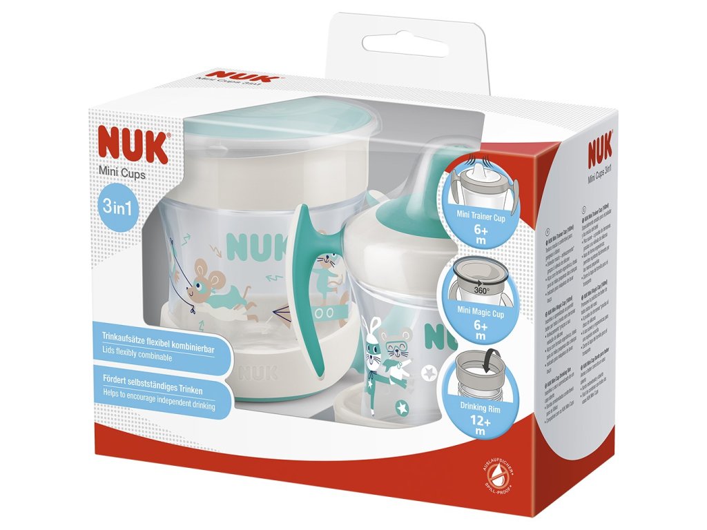 Hrníčky NUK Mini Cups 3v1. Hrneček NUK Mini Trainer Cup usnadňuje přechod miminka od lahvičky k hrnečku. Měkké pítko je obzvláště šetrné k patru a dásním miminka. Ergonomicky tvarovaná držátka mohou malé děti snadno držet v celé ruce nebo prstech. A proto se nikdo nepolije.