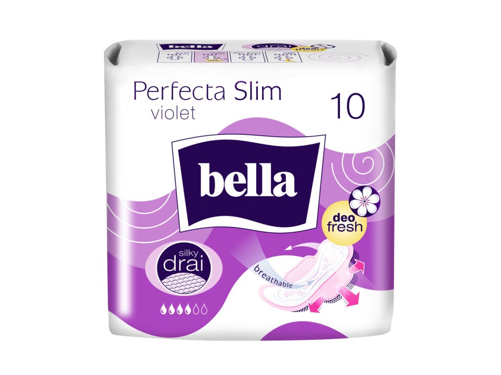 Bella Perfecta Slim Violet jsou pouze 2 mm tenké menstruační vložky s prodyšnou fólií, která chrání spodní prádlo a současně umožňuje pokožce dýchat. Vnitřní vrstvu tvoří jemná síťka SILKY DRAI, jež spolu s absorpčním jádrem neutralizuje pachy a zabraňuje protečení.