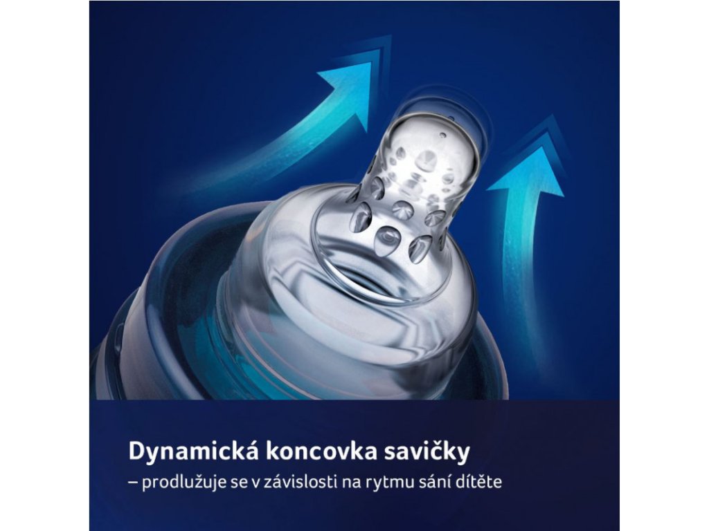 - Dynamická koncovka savičky vyrobená z tenčí vrstvy silikonu, prodlužuje se jako matčina bradavka.
