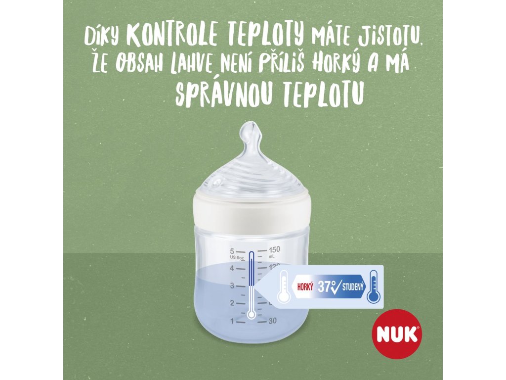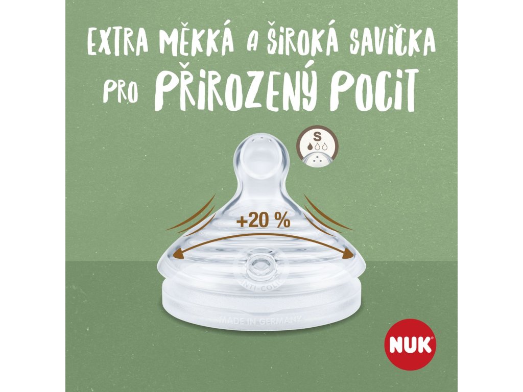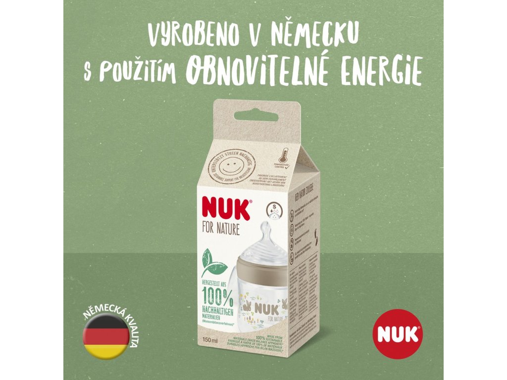 - S patentovaným indikátorem teploty NUK, neobsahuje BPA, objem 150 ml, velikost S se třemi drobnými otvory (pro pomalý průtok), lze kombinovat s jakýmkoliv příslušenstvím řady NUK for Nature a NUK Nature Sense.
