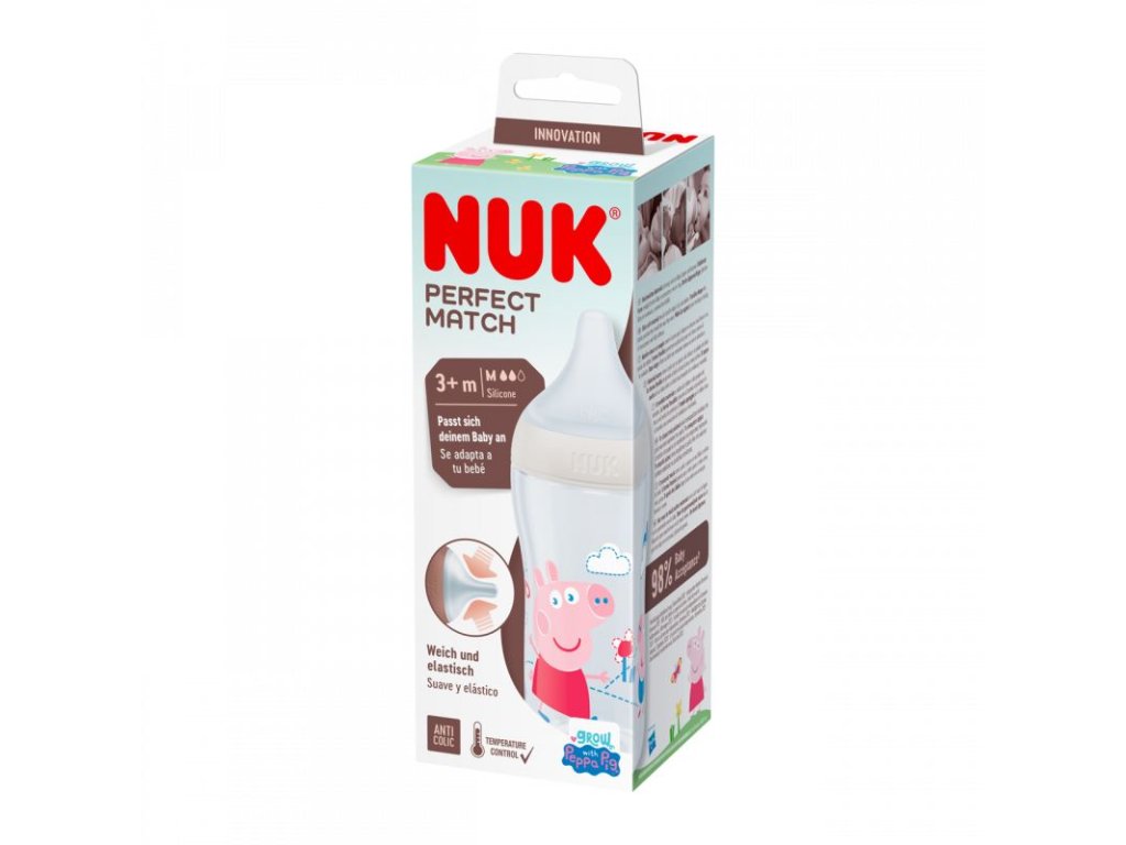 Kojenecká láhev NUK Peppa Pig Perfect Match, s měkkou silikonovou savičkou, 260 ml, od 3 měsíců, neobsahuje BPA, antikolikový systém, s indikátorem kontroly teploty, bílá